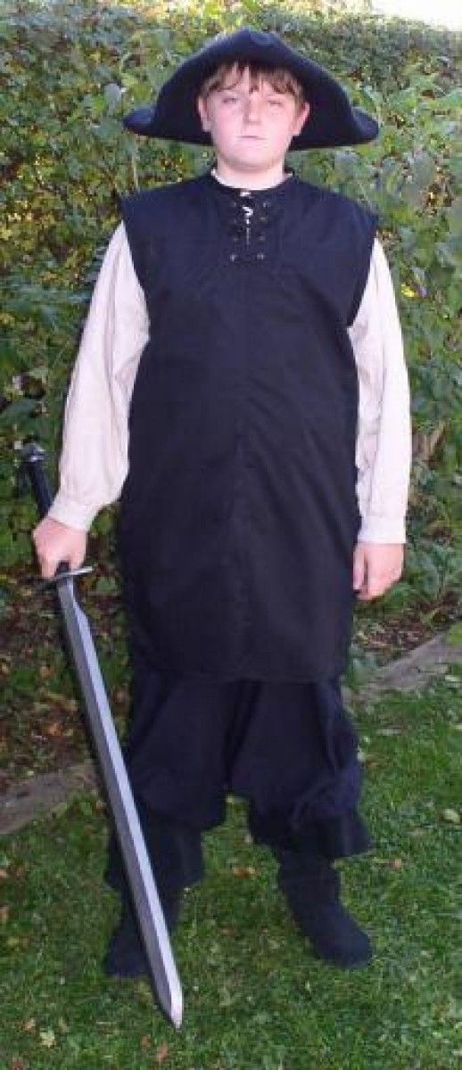 Mittelalterliche Tunika ohne Ärmel aus brauner Baumwolle zum Tragen über dem Hemd. Am vorderen Saum geschlitzt zum bequemeren Sitzen. Die Tunika ist am Kragen vorne über ein Baumwollband zum Schnüren, dadurch wird das An- und Ausziehen erleichtert. Die Tunika ist ab dem Ärmelausschnitt gerade geschnitten.