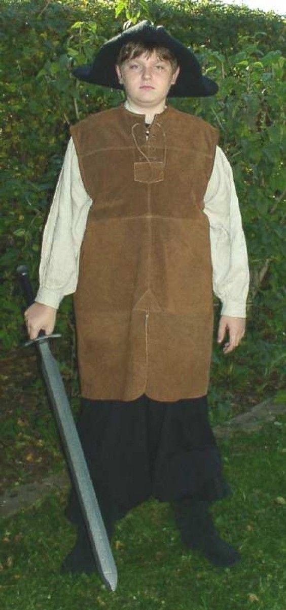 Mittelalterliche Tunika ohne Ärmel aus Wildleder zum Tragen über dem Hemd. Am vorderen Saum geschlitzt zum bequemeren Sitzen. Die Tunika ist am Kragen vorne über ein band zum Schnüren, dadurch wird das An- und Ausziehen erleichtert. Die Tunika ist ab dem Ärmelausschnitt gerade geschnitten.