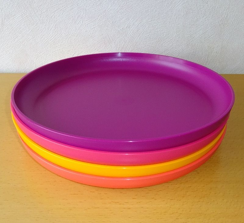 4 große, runde Aloha Teller von Tupperware ( Ø ca. 23,5 cm) in tollen Farben. Bitte beachten: Aufgrund der Lichtverhältnisse bei der Produktfotografie und unterschiedlichen Bildschirmeinstellungen kann es dazu kommen, dass die Farbe des Produktes nicht authentisch wiedergegeben wird.
