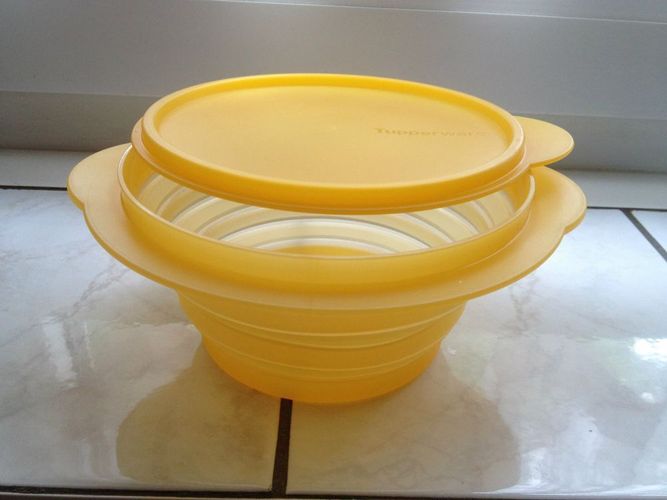 Sie bieten hier auf ein schöne neue 700ml Tupperware Mini Max Schüssel in tolle Gelb mit einen Deckel der für luft- und wasserdichten Verschluss sorgt. Dadurch ist sie ideal für Unterwegs, zum Frischhalten im Kühlschrank oder Servieren. Die Schüssel ist flexibel und lässt sich in 3 verschieden große