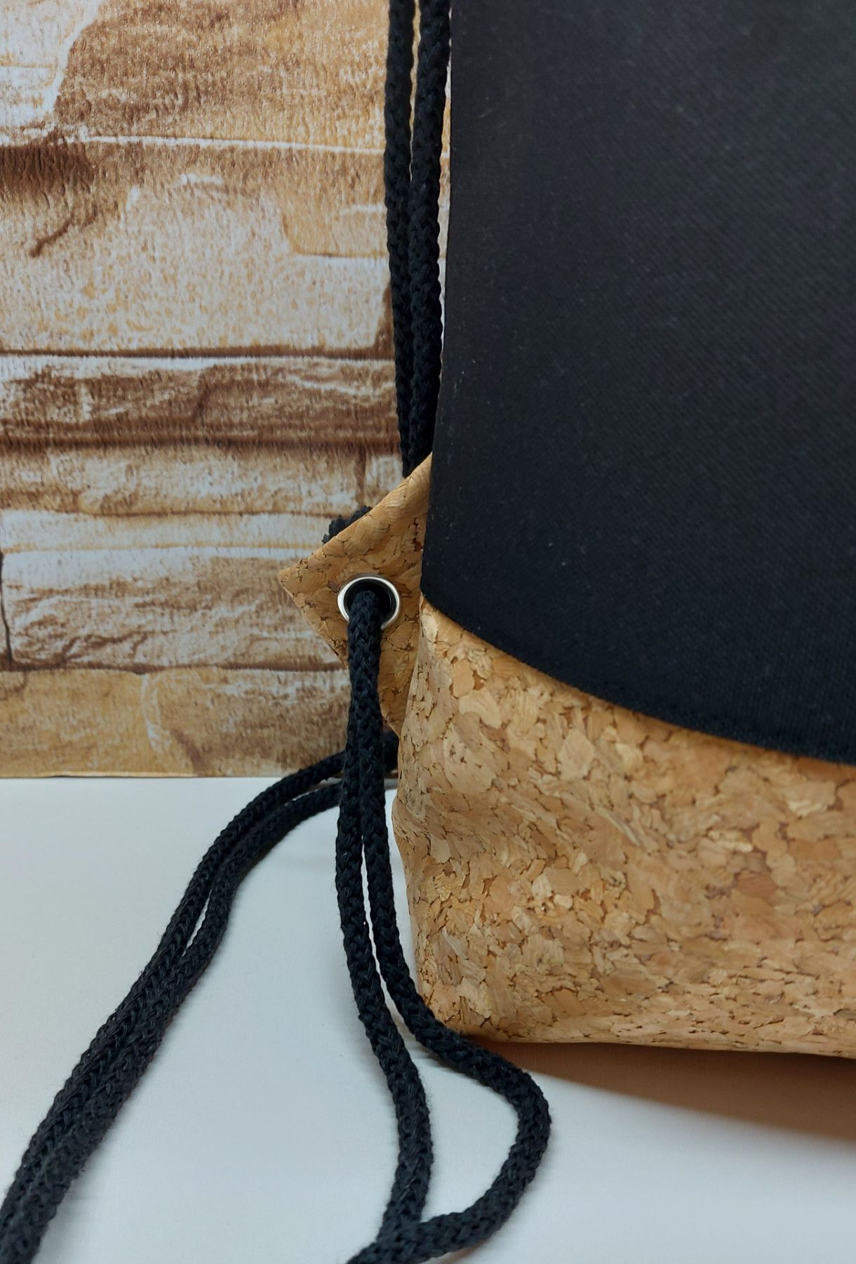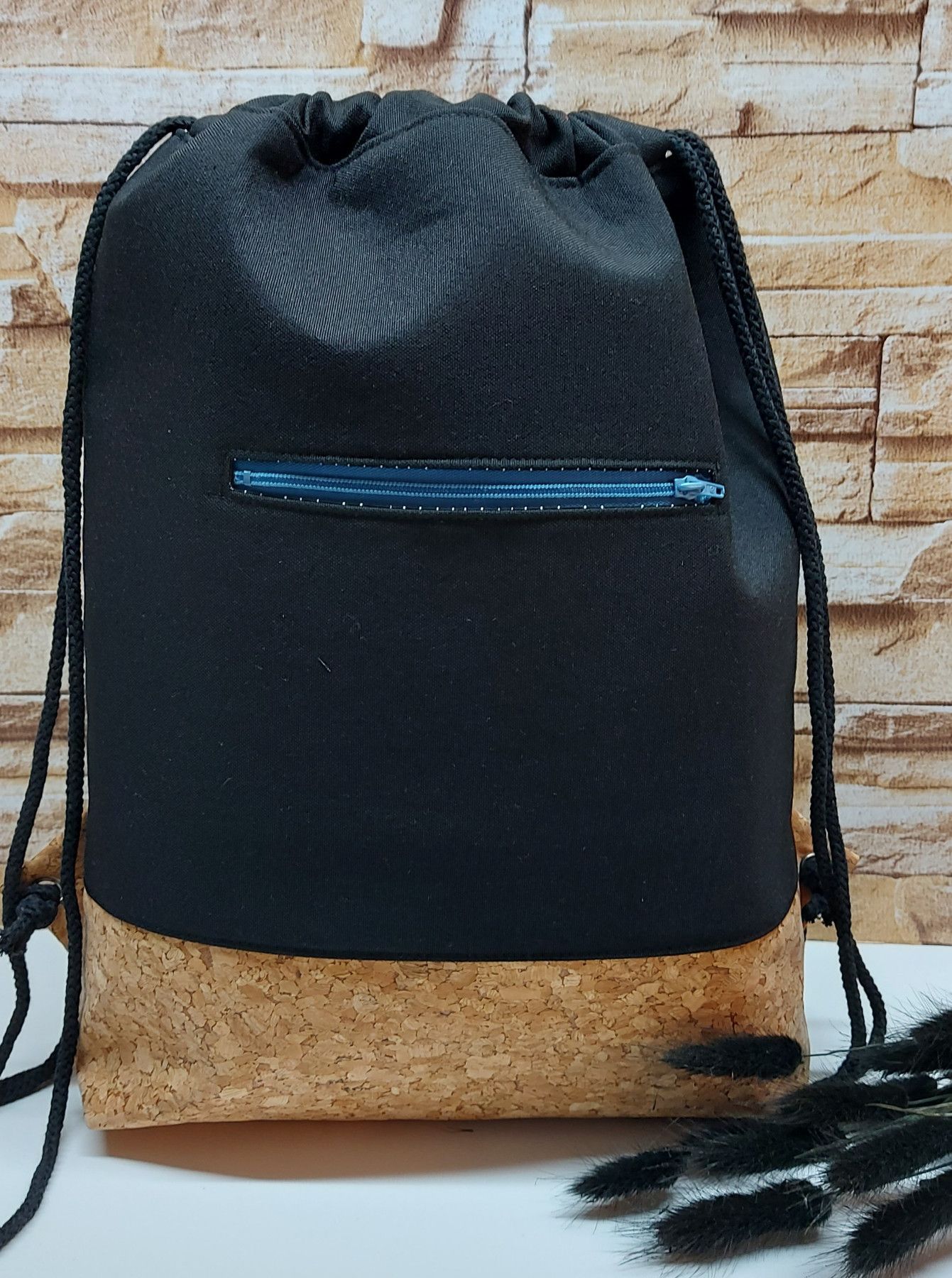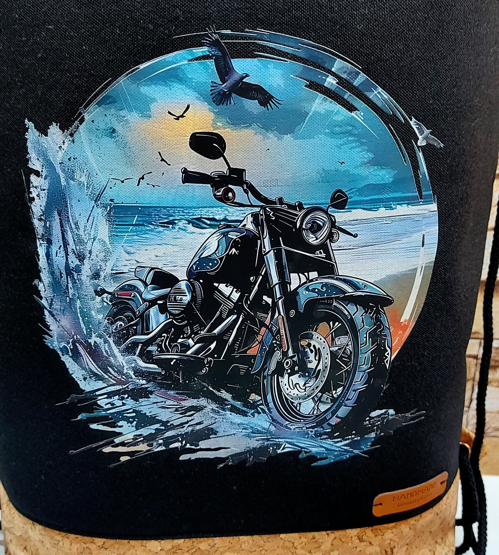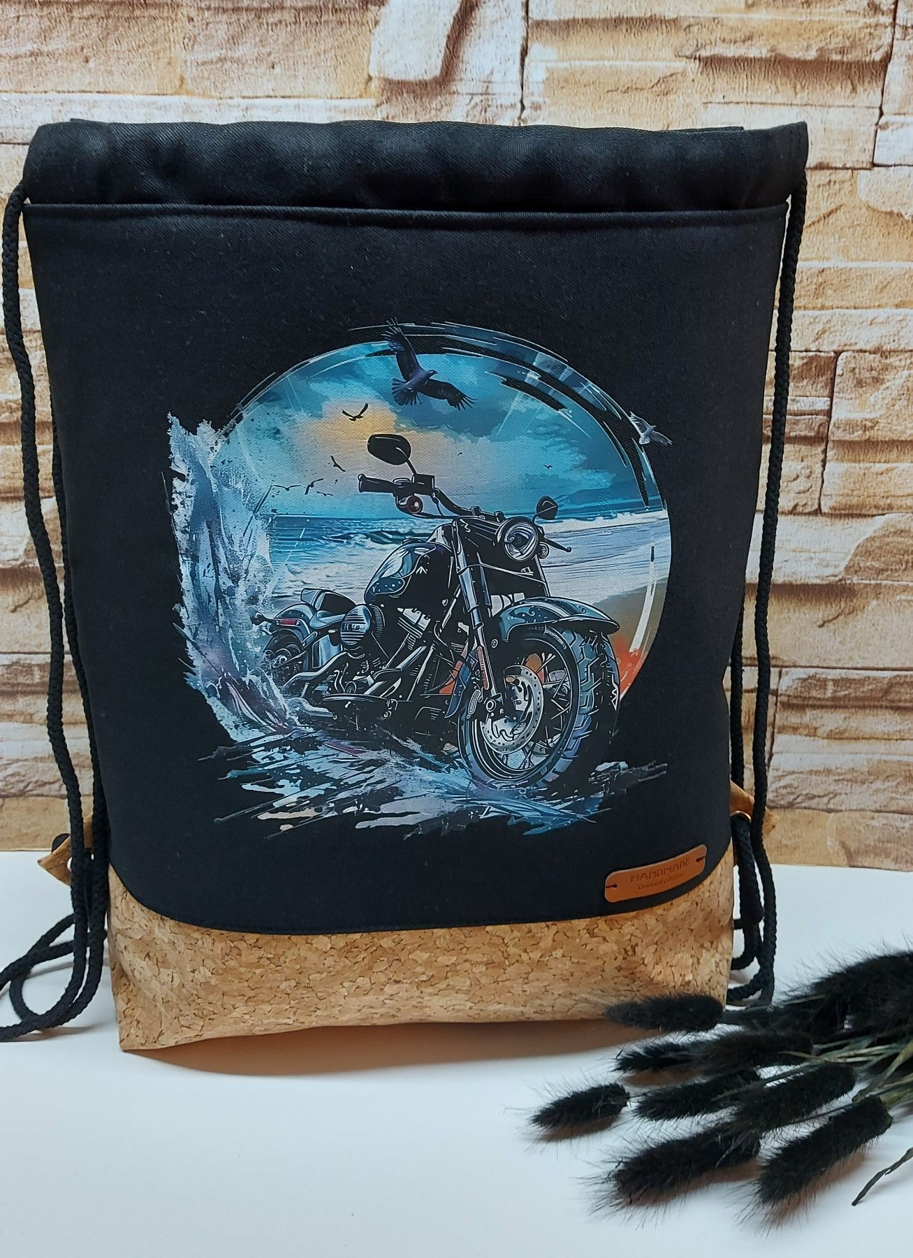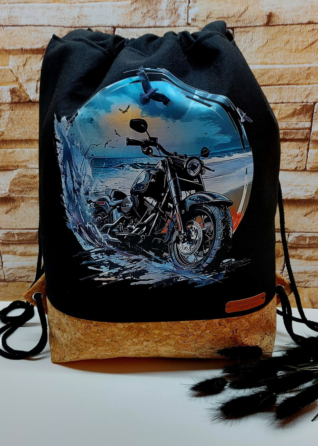 Turnbeutel Rucksack Taschenbeutel in schwarz und Kork - Meer und Motorrad