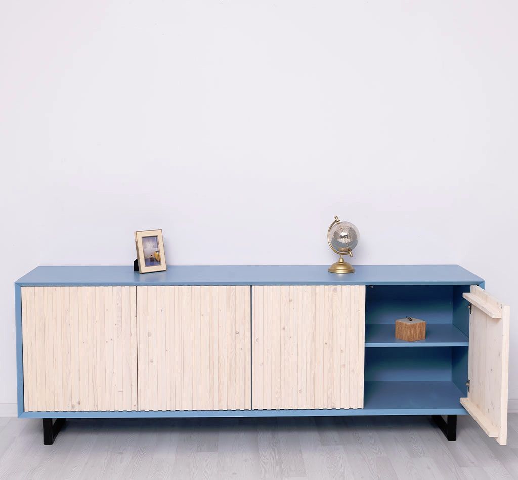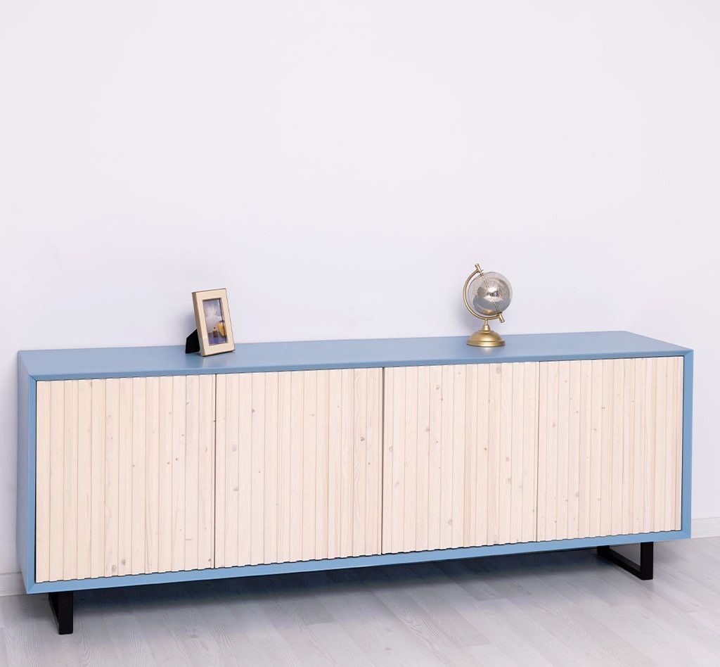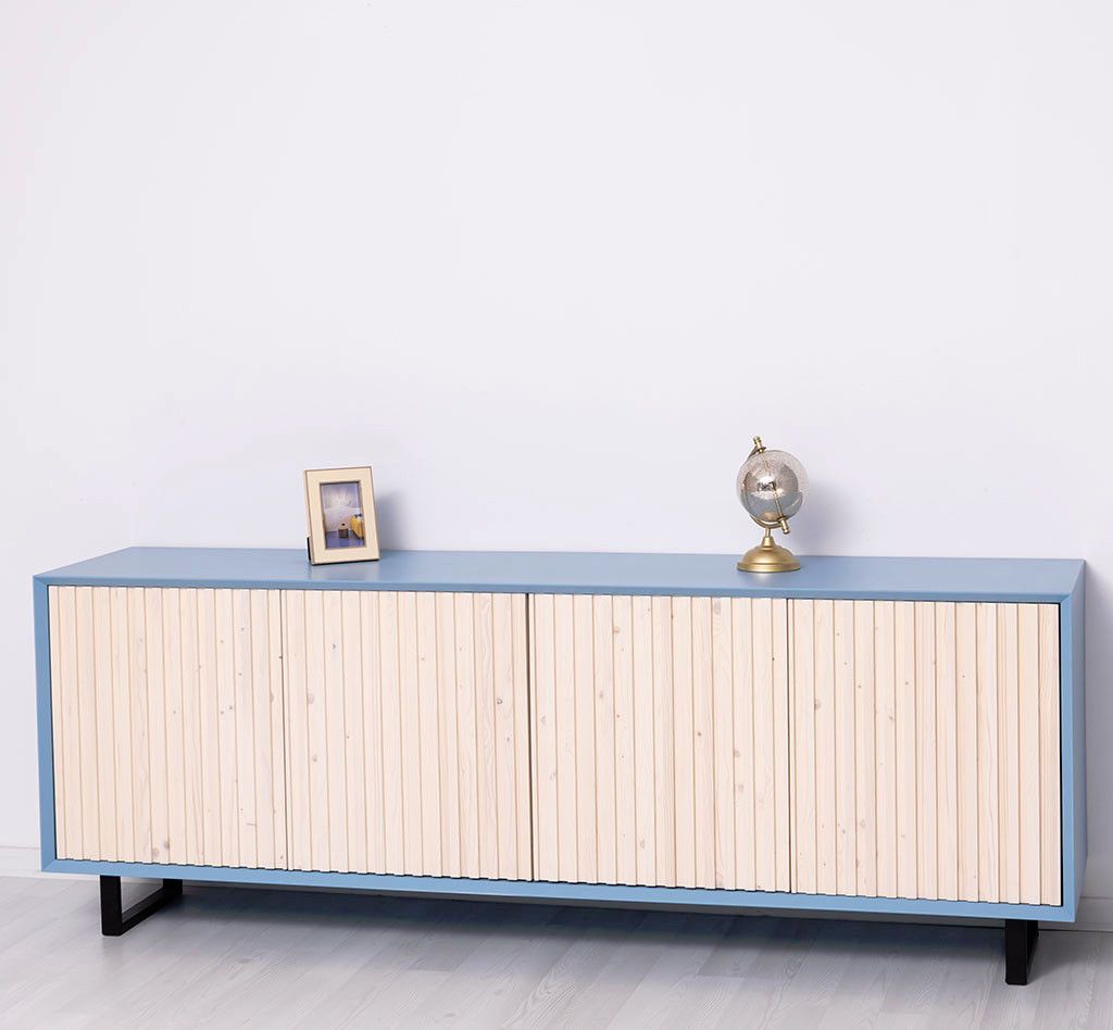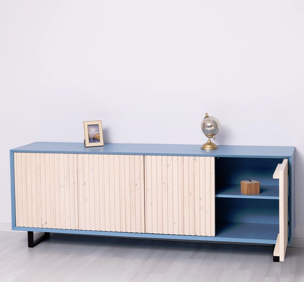 TV-Sideboard mit Lamellentüren im Skandi-Look himmelbleu / weiß geölt