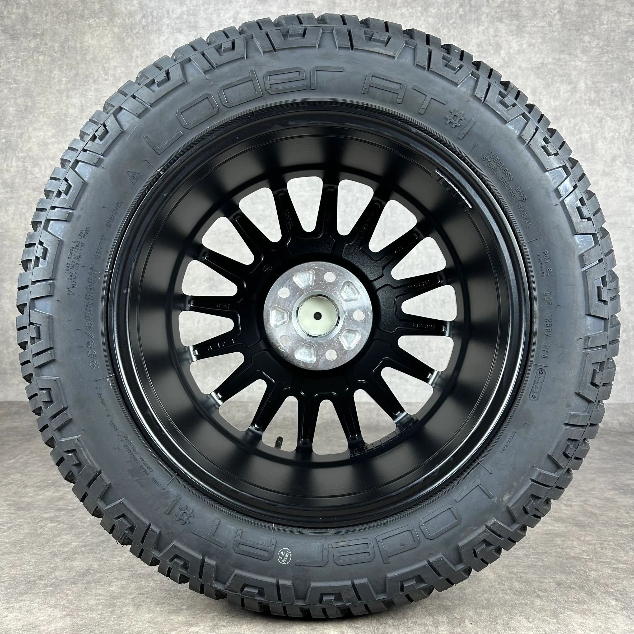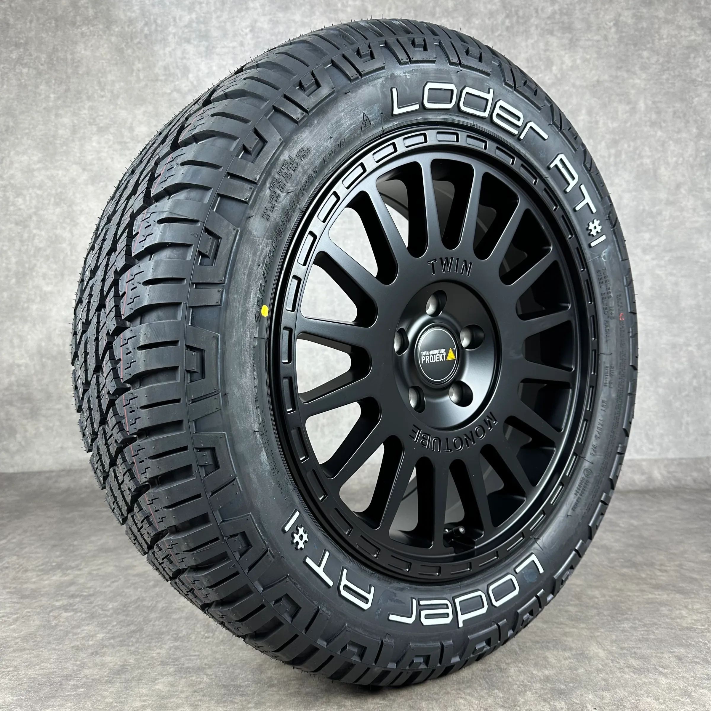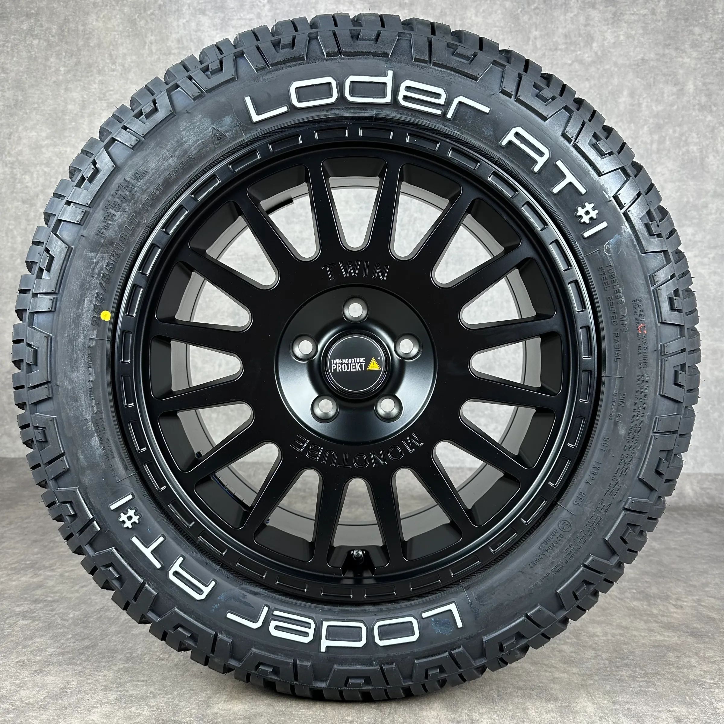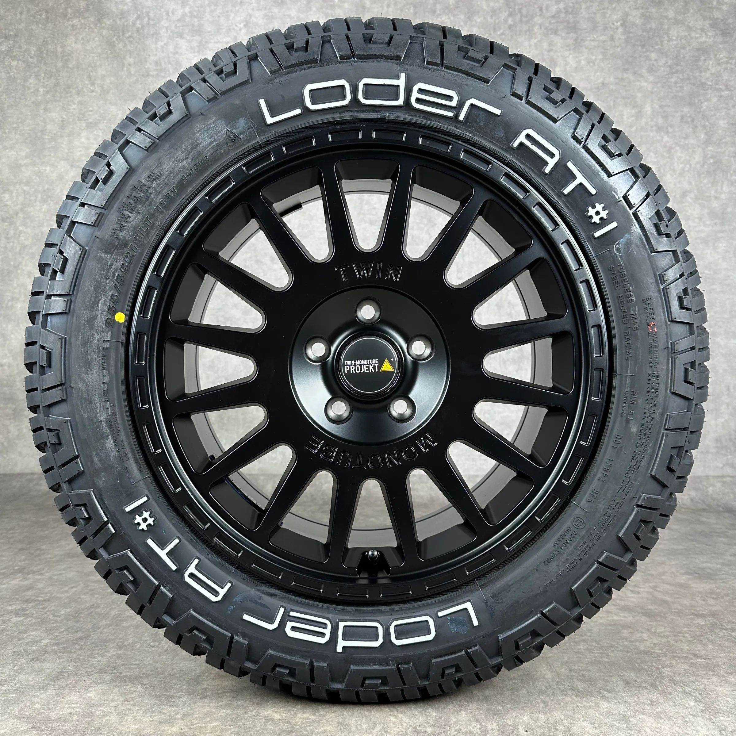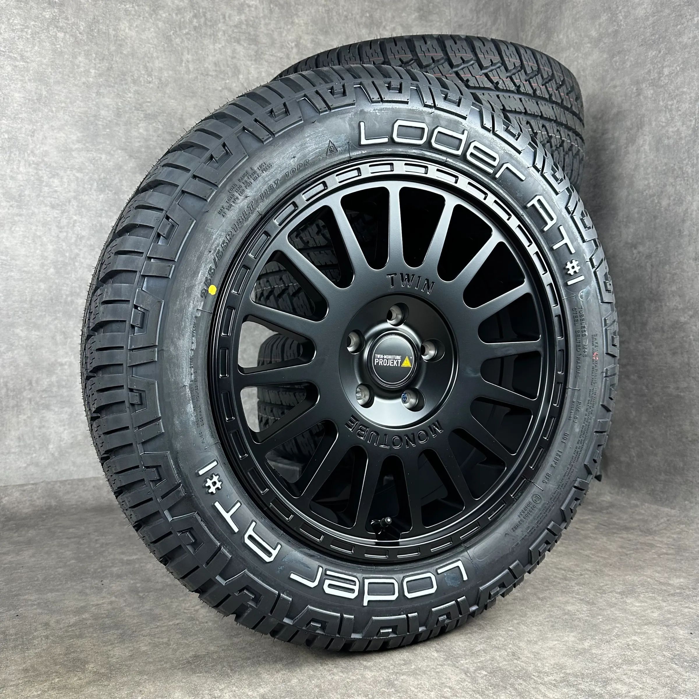 4x Original TWIN MONOTUBE 18 AT2 Felgen Ganzjahreskompletträder schwarz seidenglanz Original Lack Dimension: 8Jx18 ET45 Teilenummer: TMP-AT2 255 55 R18 118T Loder All-Terrain AT 1, neu Angeboten werden 4x Original TWIN MONOTUBE AT2 Ganzjahres-Kompletträder in schwarz seidenglanz. Die Felgen sind neu