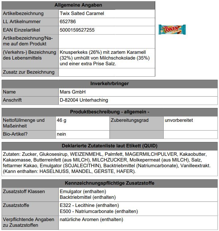Inverkehrbringer Name Mars GmbH Anschrift D-82004 Unterhaching Zutaten Zutatenliste Zutaten: Zucker, Glukosesirup, WEIZENMEHL, Palmfett, MAGERMILCHPULVER, Kakaobutter, Kakaomasse, Butterreinfett (aus MILCH), MILCHZUCKER, Molkepermeat (aus MILCH), Salz, fettarmer Kakao, Emulgator (SOJALECITHIN), Back... Mehr