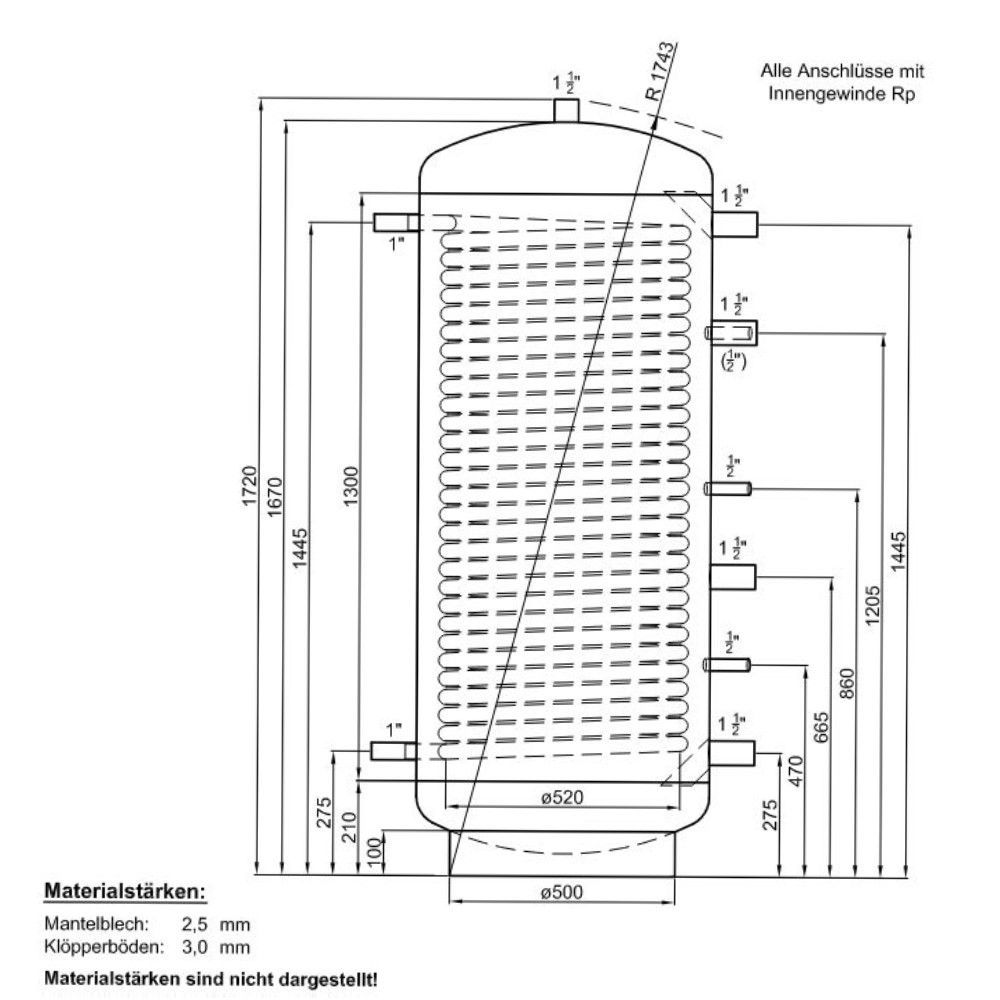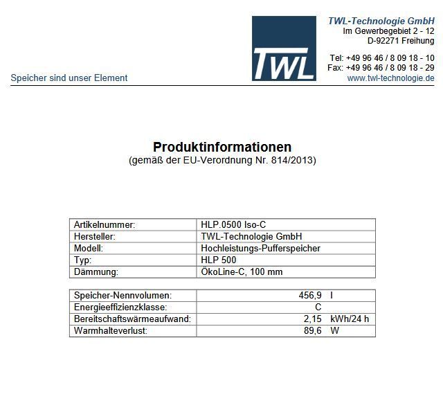 TWL Hochleistungs Pufferspeicher Typ HLP 500 Liter Isolierung C 1 Wärmetauscher