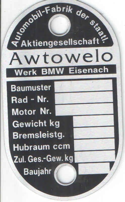 Typenschild BMW, Awtowelo, R 35, Alu, Blanko, Neu, Motorrad, Oldtimer