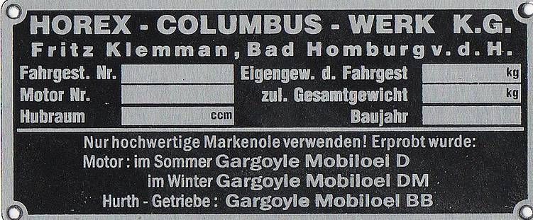 Typenschild Horex-Columbus-Werk Blankotypenschild Alu: Fahrgest.Nr. Eigengew Motor Nr. zul. Gesamtgewicht Hubraum Baujahr Breite 9,4 cm Höhe 4,0 cm