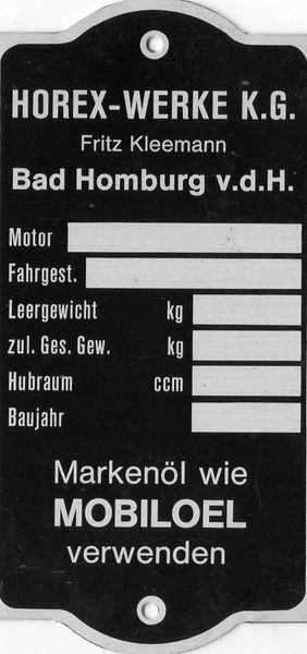Typenschild Horex-Werke Blankotypenschild Alu Motor Fahrgest. Leergewicht zul.Ges.Gew. Hubraum Baujahr 9,2 cm x 4,5 cm