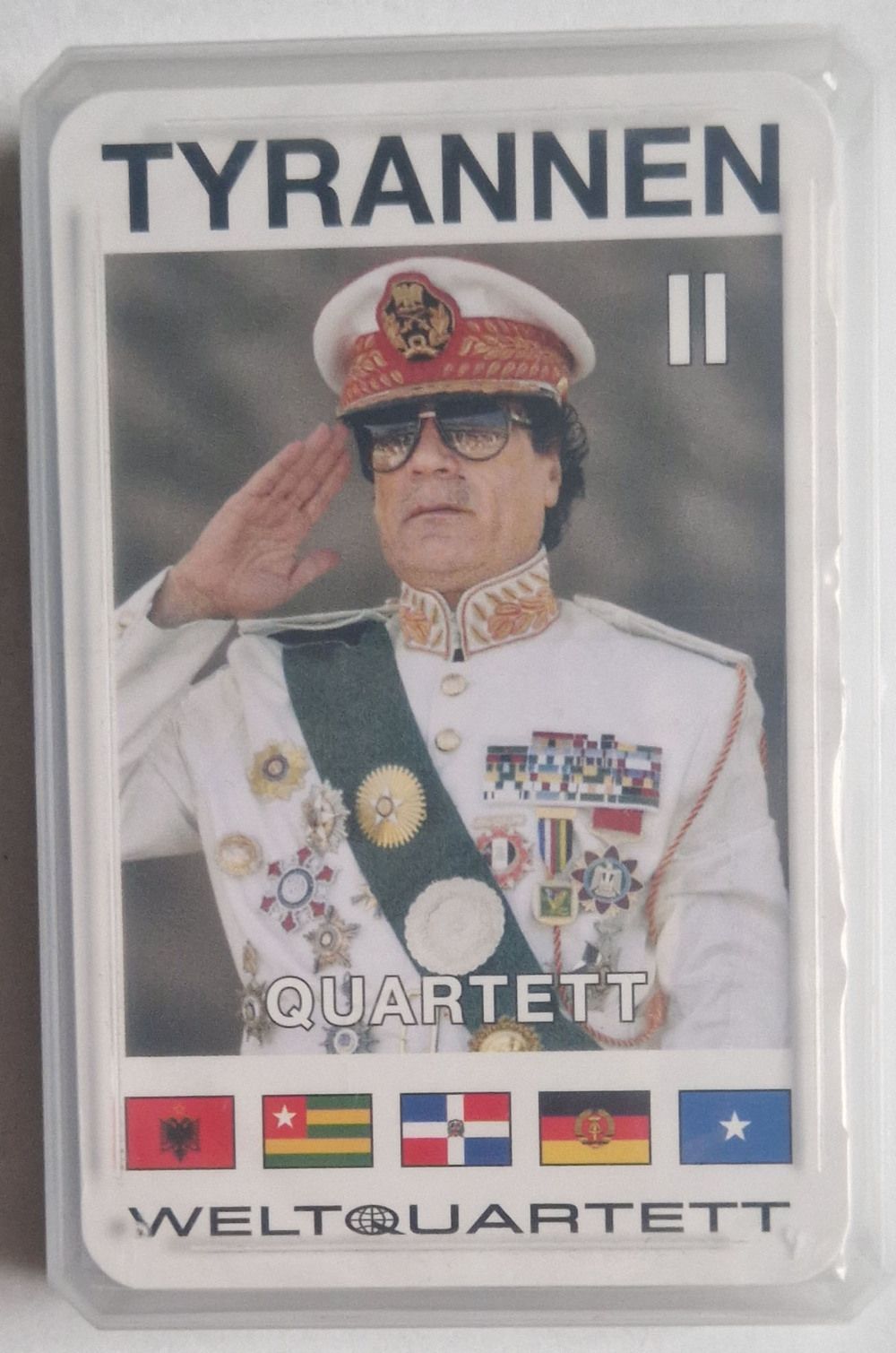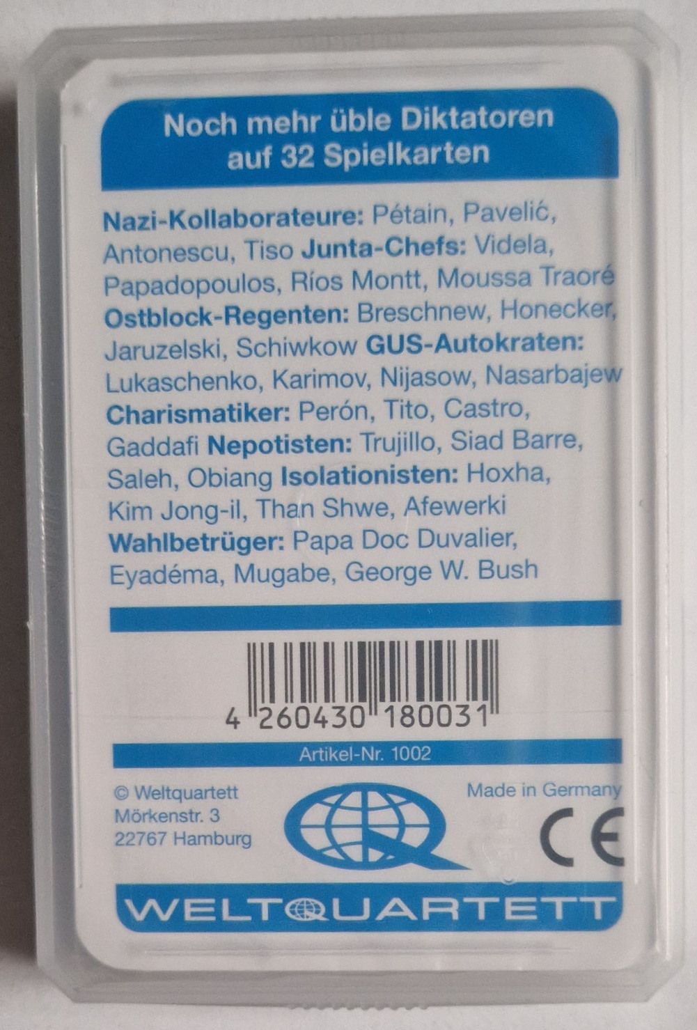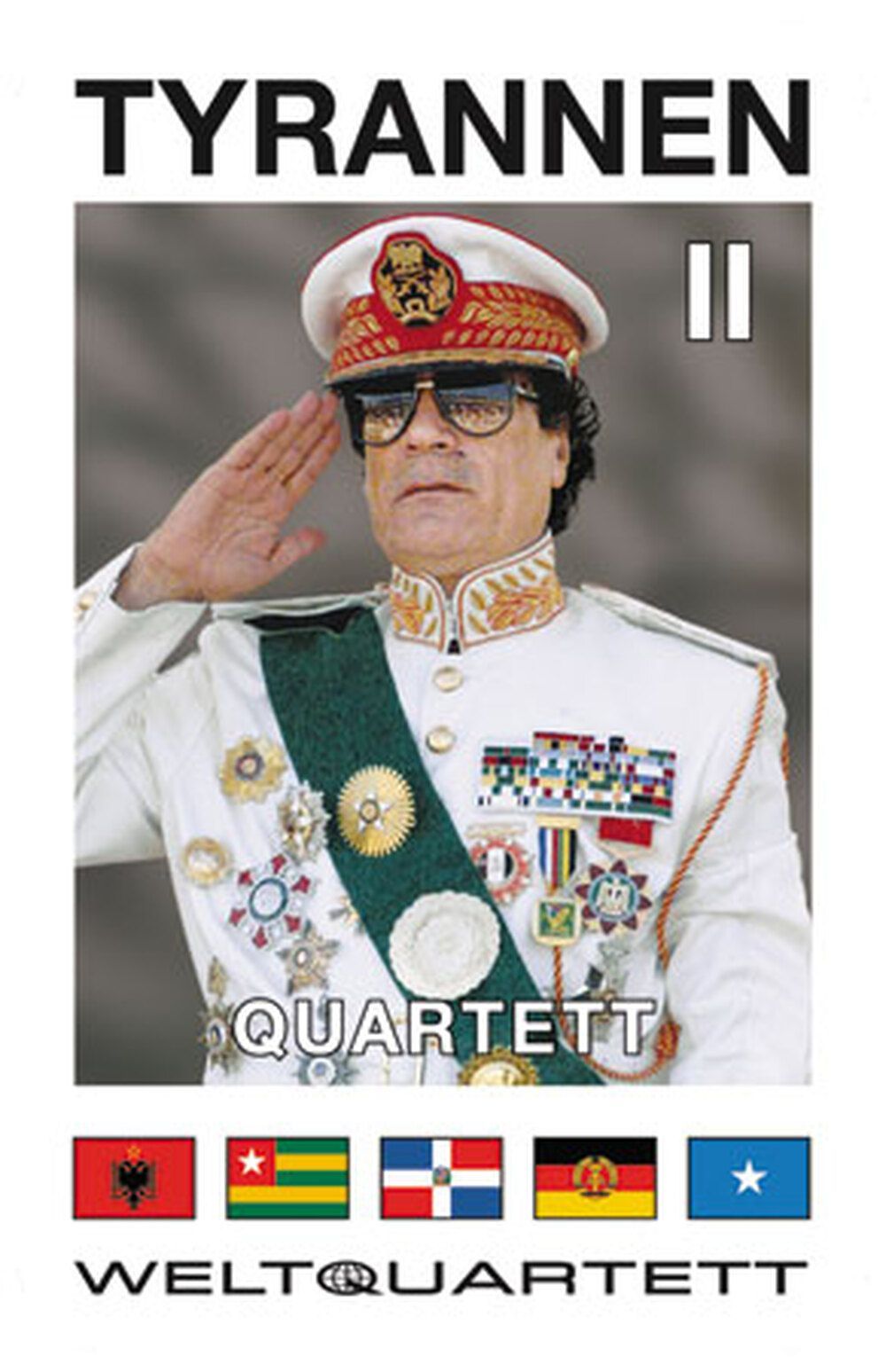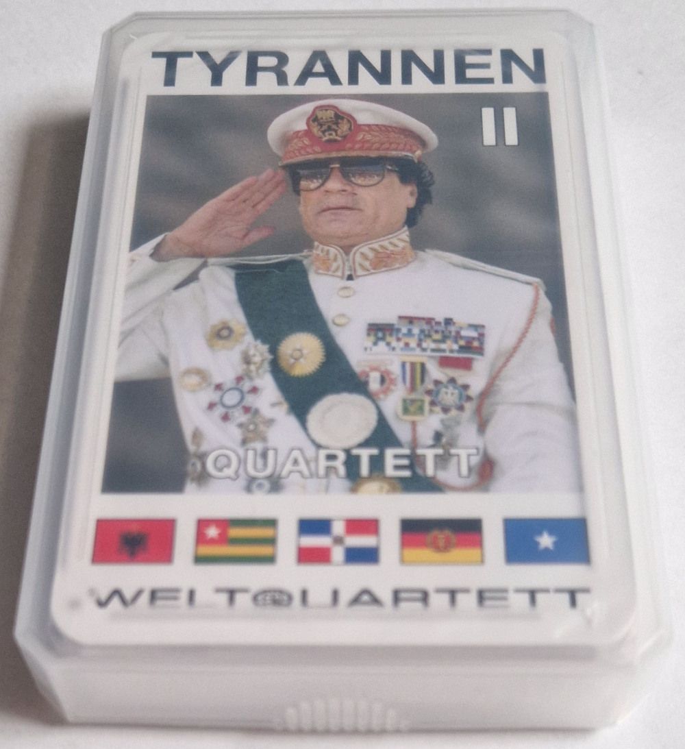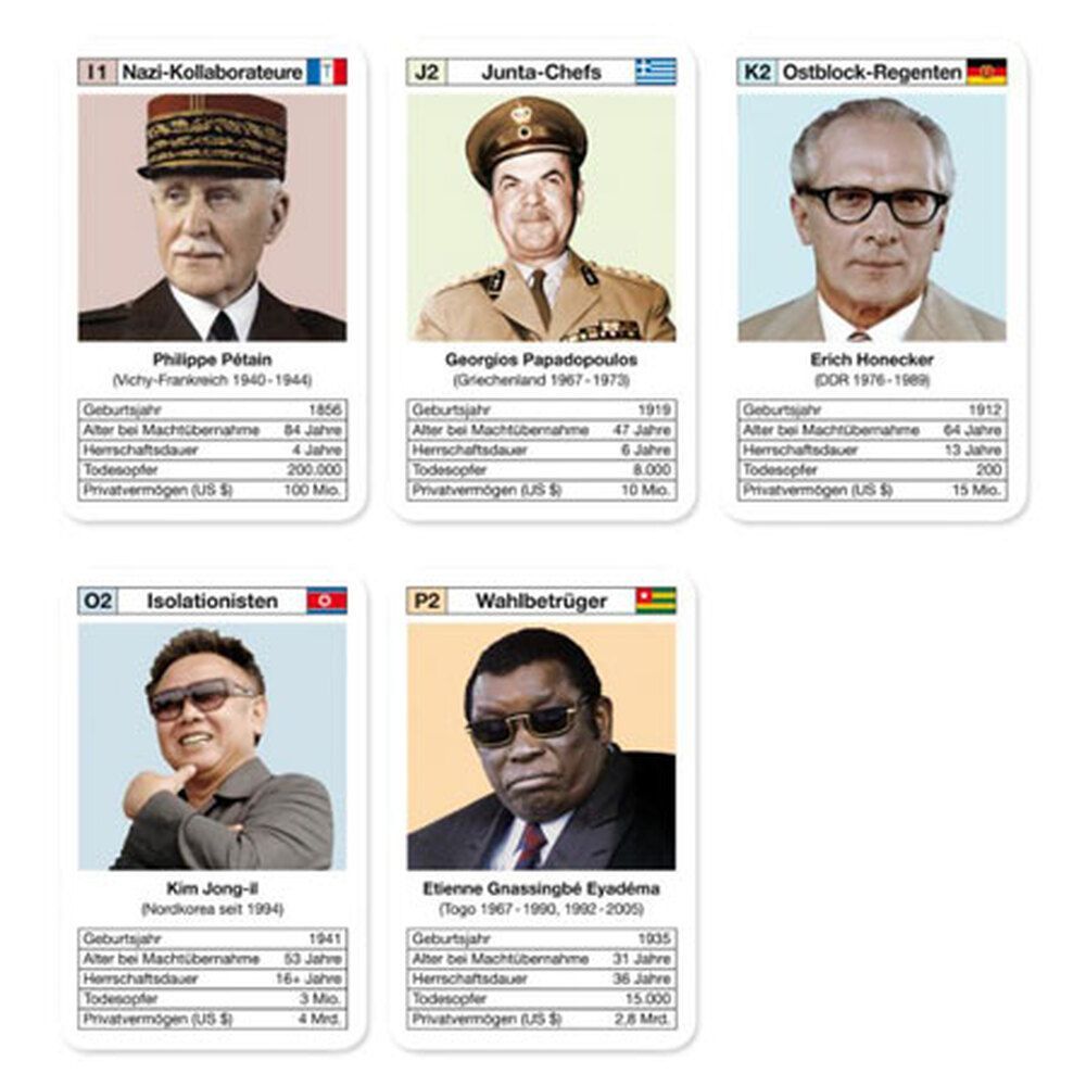 Kim Jong-il, Gaddafi, Mugabe, Castro, Tito, Perón, Honecker, Breschnew, Nijasow, u.v.a. Quartettgruppen: Nazi-Kollaborateure, Junta-Chefs, Ostblock-Regenten, GUS-Autokraten, Charismatiker, Nepotisten, Isolationisten, Wahlbetrüger Spielkategorien: Geburtsjahr, Alter bei Machtübernahme, Herrschaftsdau... Mehr