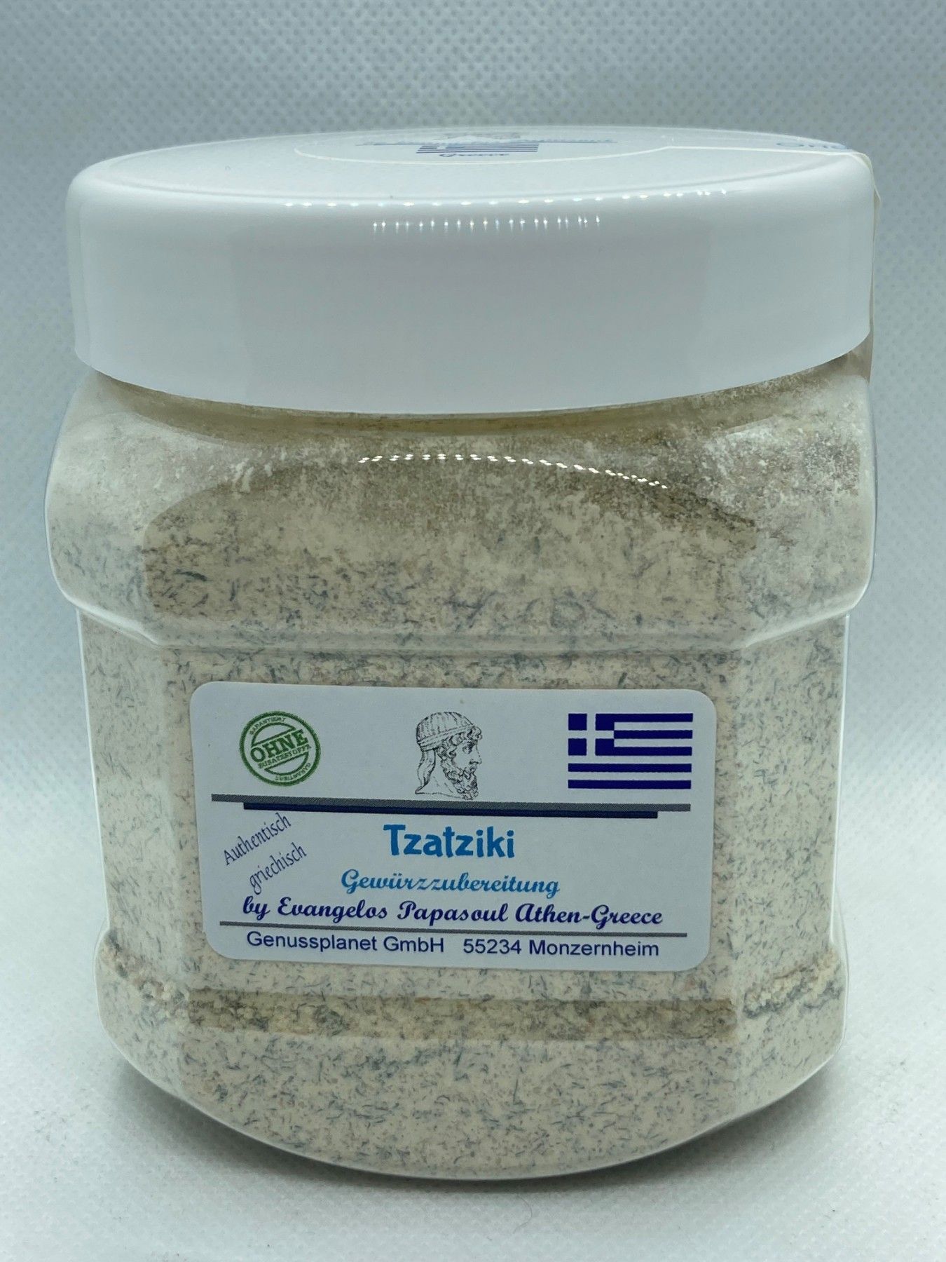 machhtml Genussplanet _____________________________________________________________ Tzatziki Gewürzzubereitung by Evangelos Papasoul Gewürzzubereitung für ein authentisch griechisches Tzatziki Zutaten: Meersalz, Knoblauch, Zwiebel, Dill, Pfeffer Doseninhalt: 350 gr. ausreichend für ca. 13 Kg Joghurt