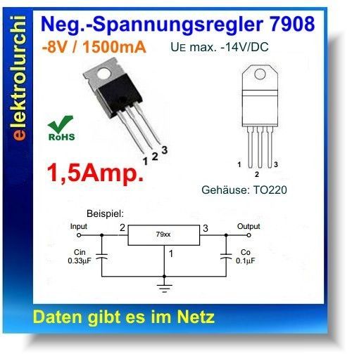 Sie bieten hier auf folgenden Artikel 3 Stück UA7908C , L7908CV, MC7908CT- Neg.-Spannungsregler -8V, 1.5Amp., 7908, TO220 Ausgangsspannung: -8V DC (Negativ) Strom: Amp. = 1500mA Gehäuse TO220 (Bild zeigt die Gehäuseform) Hersteller : Verschiedene