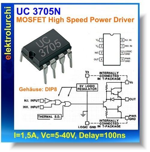 UC3705N - MOSFET 1,5A High Speed Power Treiber, IC, DIP8, Unitrode, 2St.
