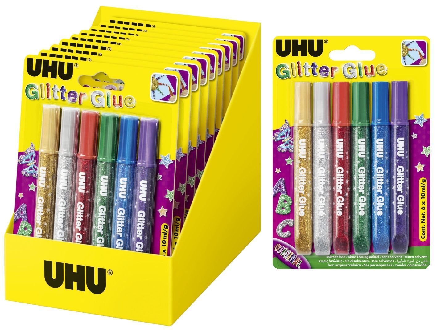 UHU® 39040 Young Creativ' Glitter Glue - 6 x 10 ml, 6 Farben sortiert, Infokarte
