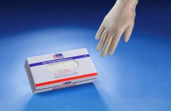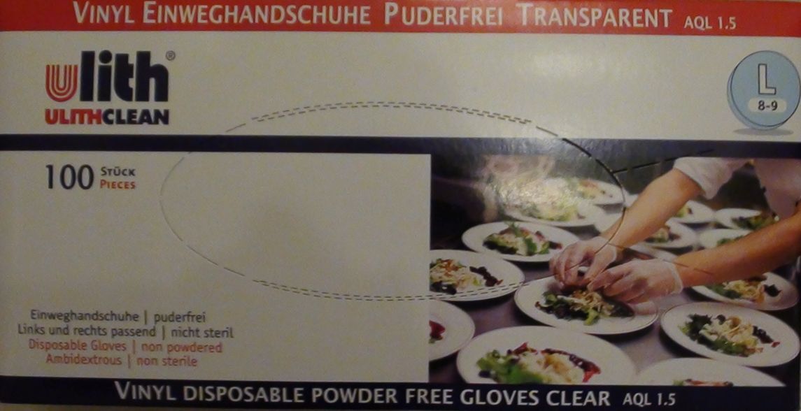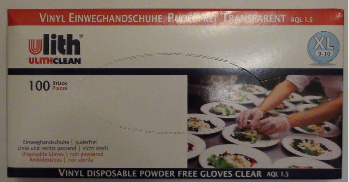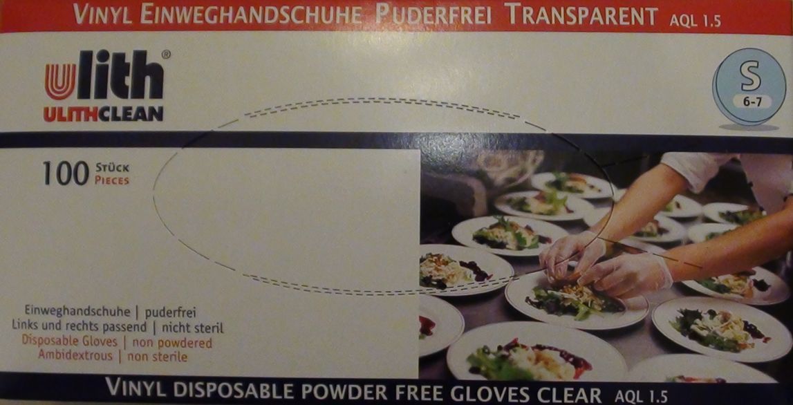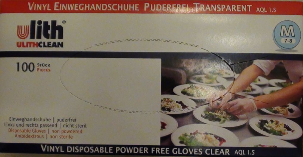 Ulith Vinyl-Einweghandschuhe unsteril puderfrei Untersuchungshandschuhe aus Vinyl Typ 50 ca. 240 mm lang Farbe transparent Box 100 Stück Erfüllung der Anforderungen von EN 455, EN 420,ASTM D6319 Hergestellt gemäß GMP Lebensmitteltauglichkeit nach ISO 9001 & ISO 13485 AQL1,5