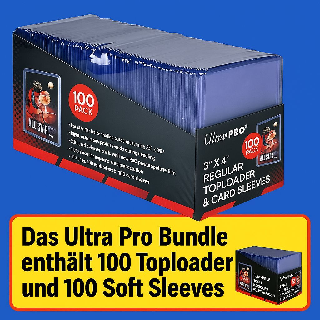 Ultra Pro Toploader & Sleeves – 100 Stück Produktbeschreibung: Das Ultra Pro Bundle enthält 100 Toploader und 100 Soft Sleeves zur sicheren Aufbewahrung und Präsentation von Sammelkarten im Standardformat (63,5 mm x 88,9 mm 2½ x 3½ ). Ideal für Sammelkarten, Sportkarten und m