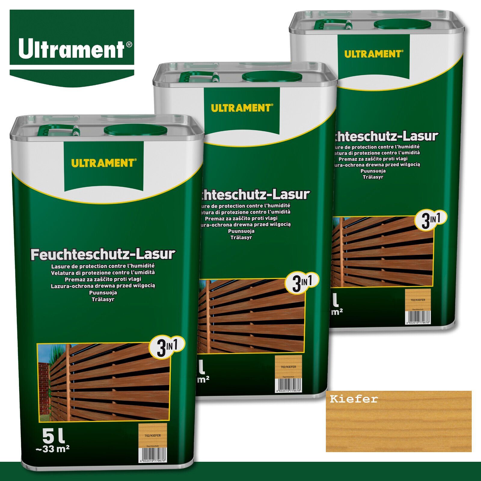 Ultrament 3 x 5 l Feuchteschutz Lasur 3in1 Holzlasur für Pergola Zaun Tor Kiefer