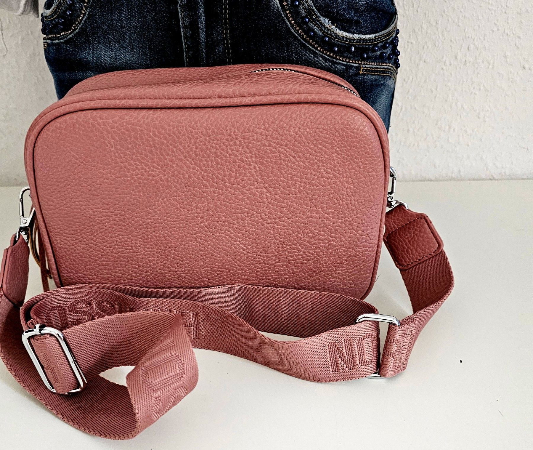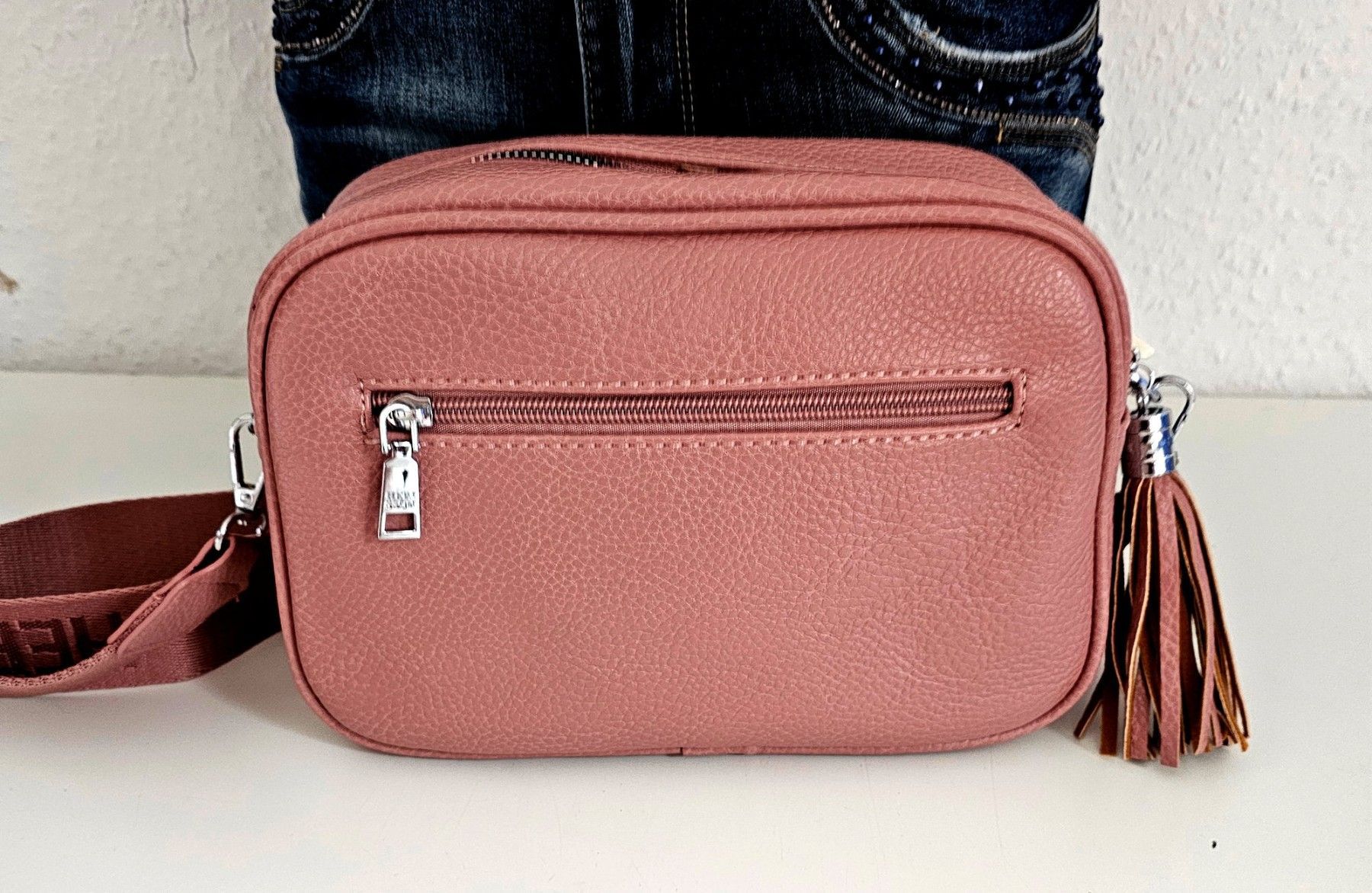 Umhängetasche Schultertasche Cross Body Bag Kunstleder breiter Gurt Quaste Altrosa