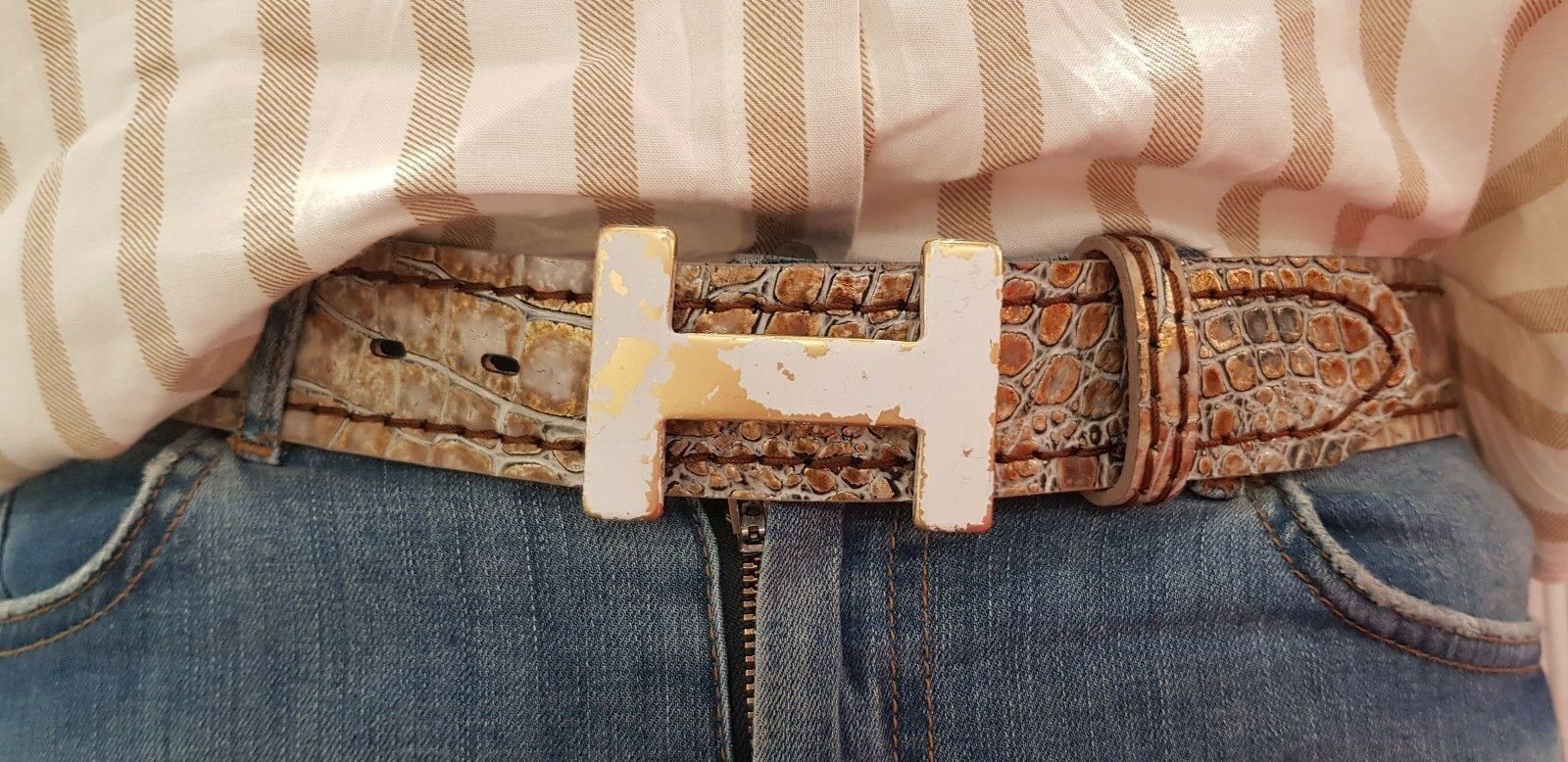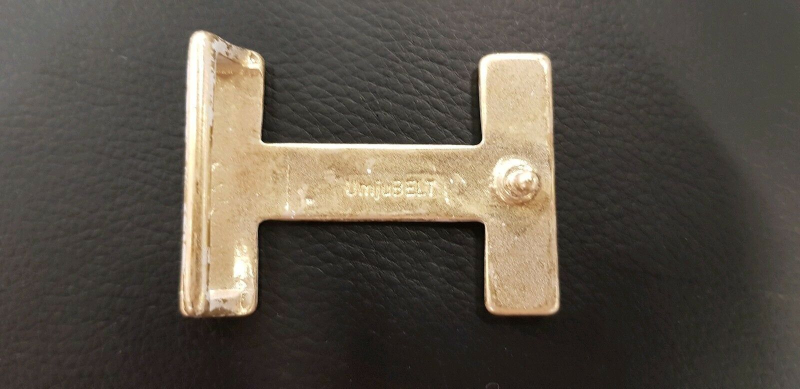 Umjubelt Gürtelschnalle - Gürtelschließe H-Level Details: H-Level Weiss-Gold-matt 5x7cm Für alle 4cm breite Wechselgürtel mit Druckknopfsystem Made in Italy by Umjubelt ca 40g schwer nickelfrei Neuware Die weiß-gold Maserung fällt bei jeder Schnalle individuell aus. Die Lieferung umfasst nur die Gür