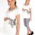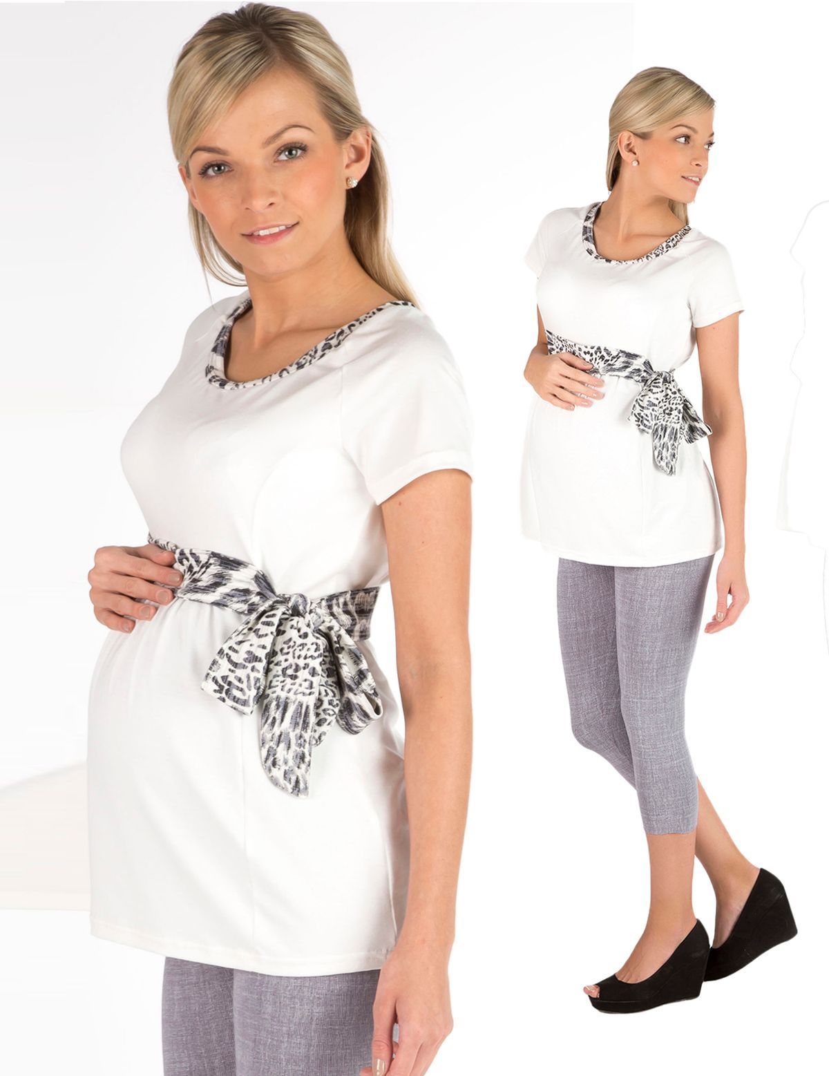 Umstands-Longshirt Kurzarm T-Shirt, mit Bindeband Leoparden-Muster am Rundhalsausschnitt und Bindeband Größen zur Auswahl: S M, L XL, 2XL 3XL, 4XL 5XL Farbe: weiss Material: 95% Viskose, 5% Elasthan
