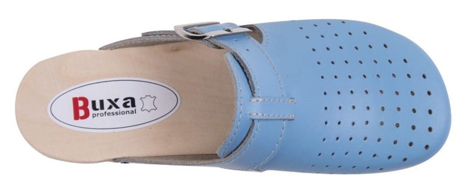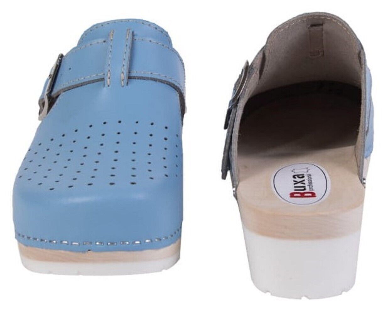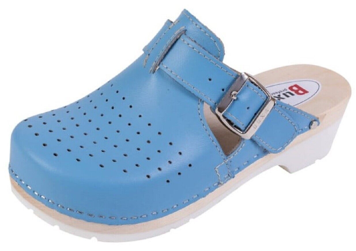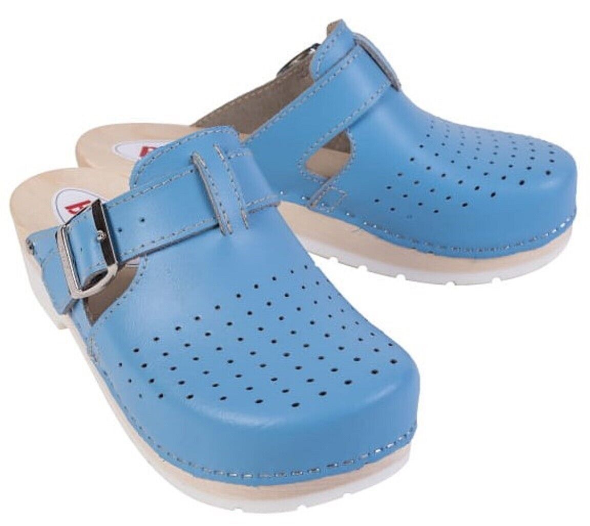 Unisex Schweden HOLZ CLOGS Clogs mit PU- Gummi-Laufsohle Gr. 46 BLAU *** Obermaterial - Naturleder *** Anatomische geformte Innensohlen aus Naturholz - nicht lackiert *** Aussensohle - Rutschfeste PU-Laufsohle *** Absatzhöhe: 5,00 cm *** Neu *** Sehr hochwertige Verarbeitung *** Ein reines Naturprod