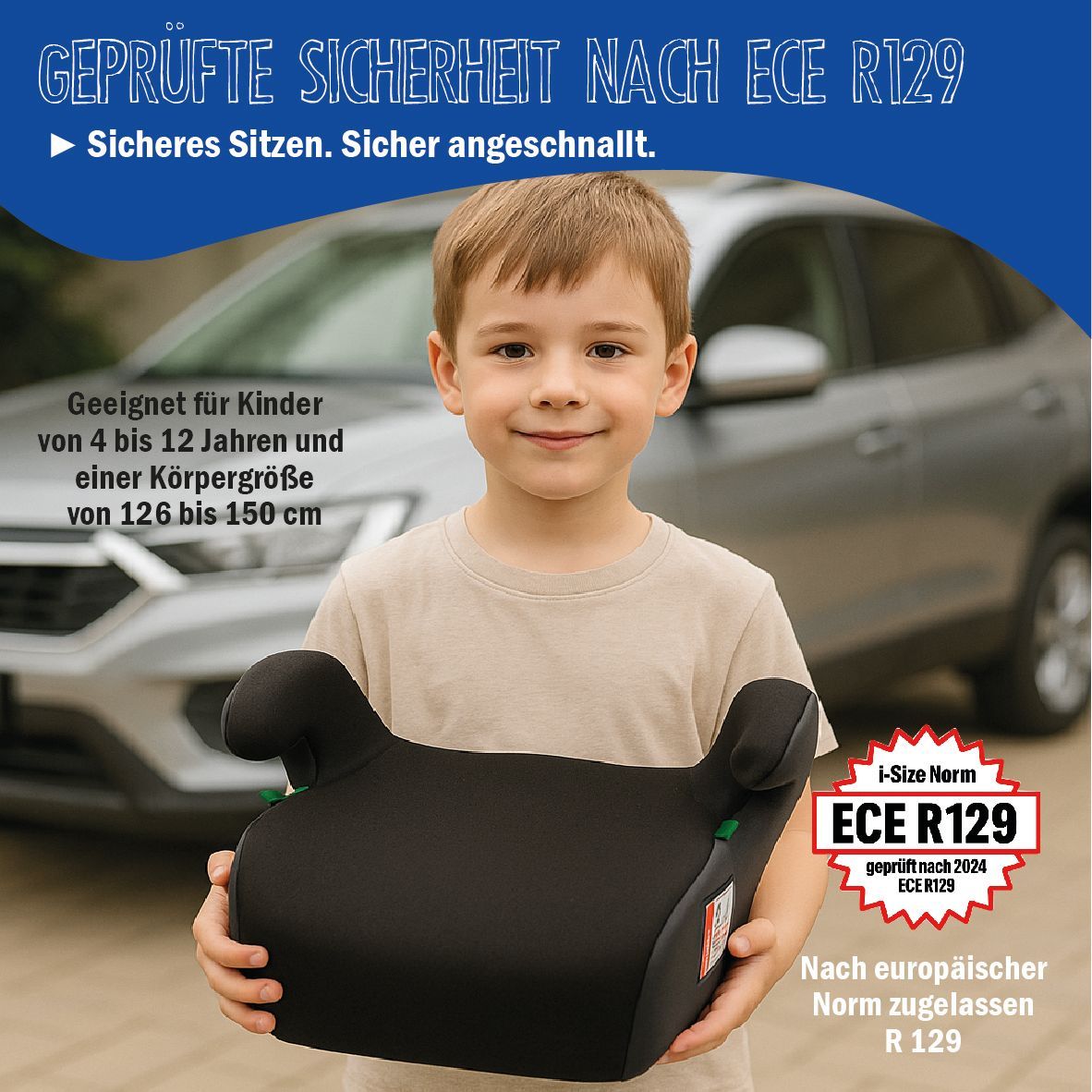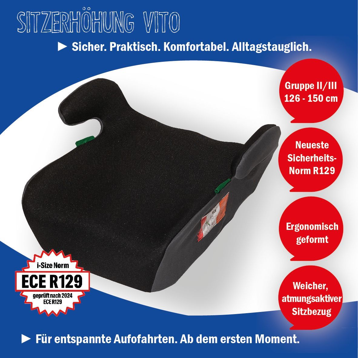 Die Autositzerhöhung Vito von UNITED KIDS erfüllt alle aktuellen Sicherheitsstandards und ist nach der neuen europäischen iSize Prüfnorm ECE R129 getestet und zugelassen. Diese Sitzerhöhung ist speziell für Kinder mit einer Körpergröße von 126 bis 150 cm geeignet, was in etwa einem Alter von 5 bis 1