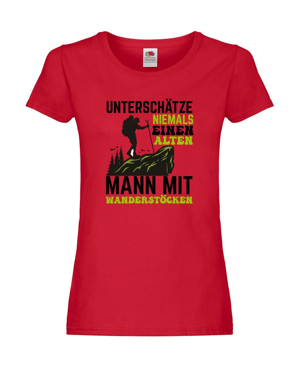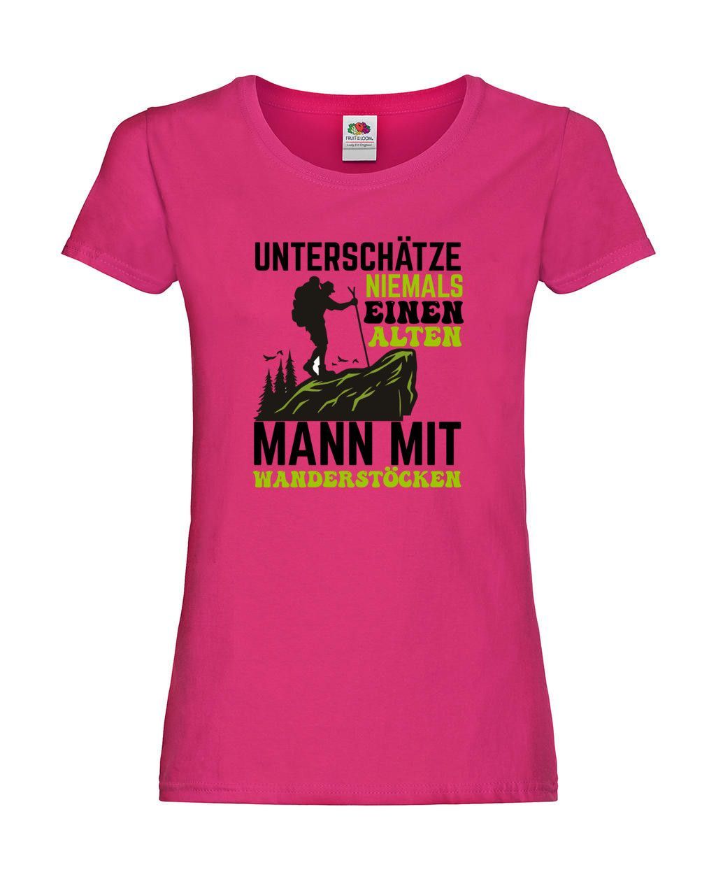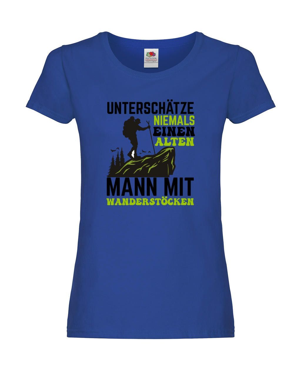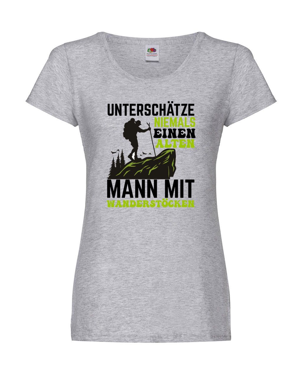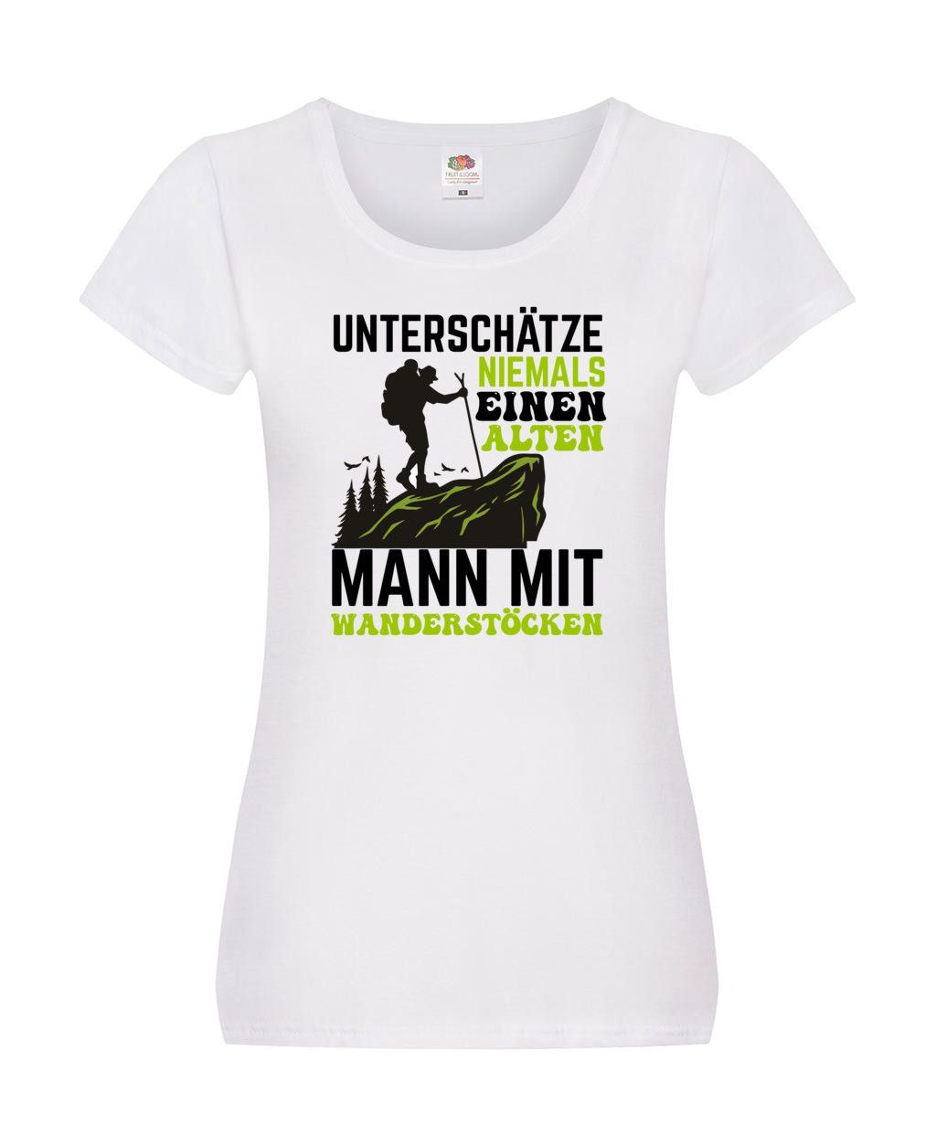 Unterschätze niemals einen alten Mann mit Wanderstöcken Damen Shirt Weiß