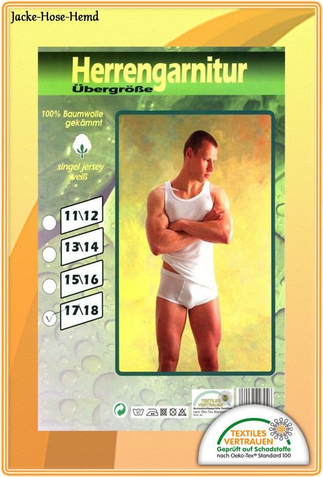 Herren-Garnitur, Slip und Unterhemd in Übergröße 5 bis 18 Produktbeschreibung: Herren Garnitur, Slip und Unterhemd, Größen 5 bis 18 Diese komfortable Unterwäschegarnitur in Übergröße umfasst ein weißes Achselhemd und einen passenden Slip aus 100 % gekämmter Baumwolle. Der feine Single-Jersey-Stoff b
