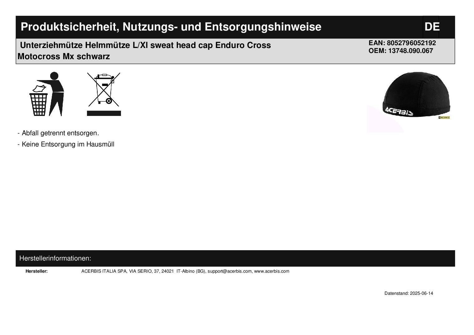 Acerbis Unterziehmütze Helmmütze L/Xl sweat head cap Enduro Cross Motocross Mx schwarz