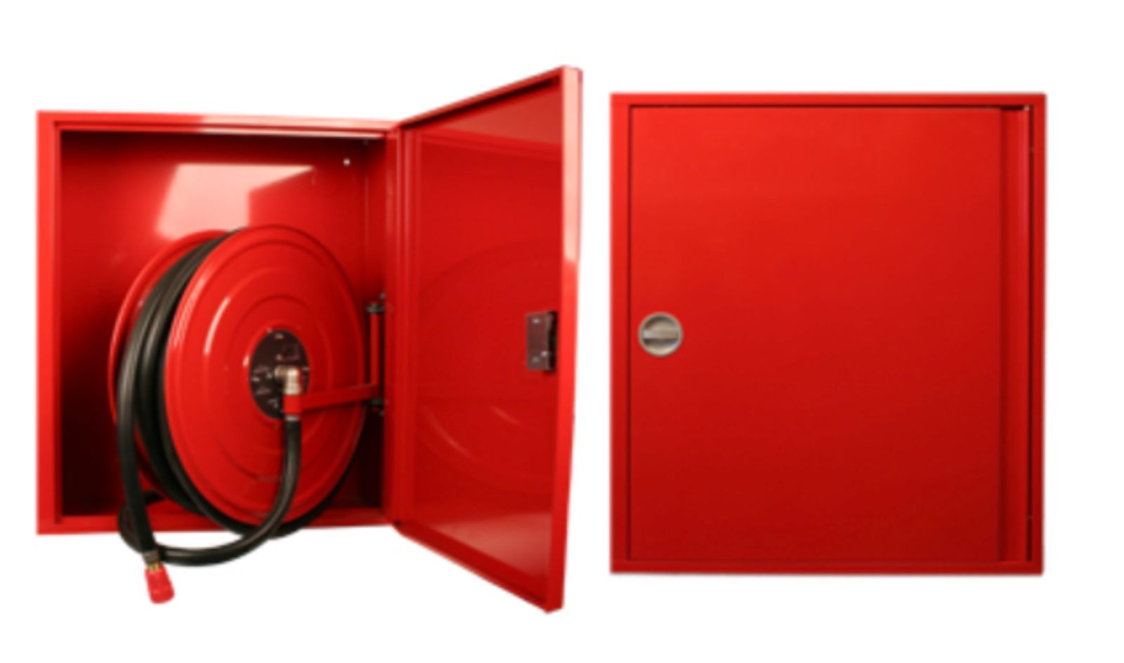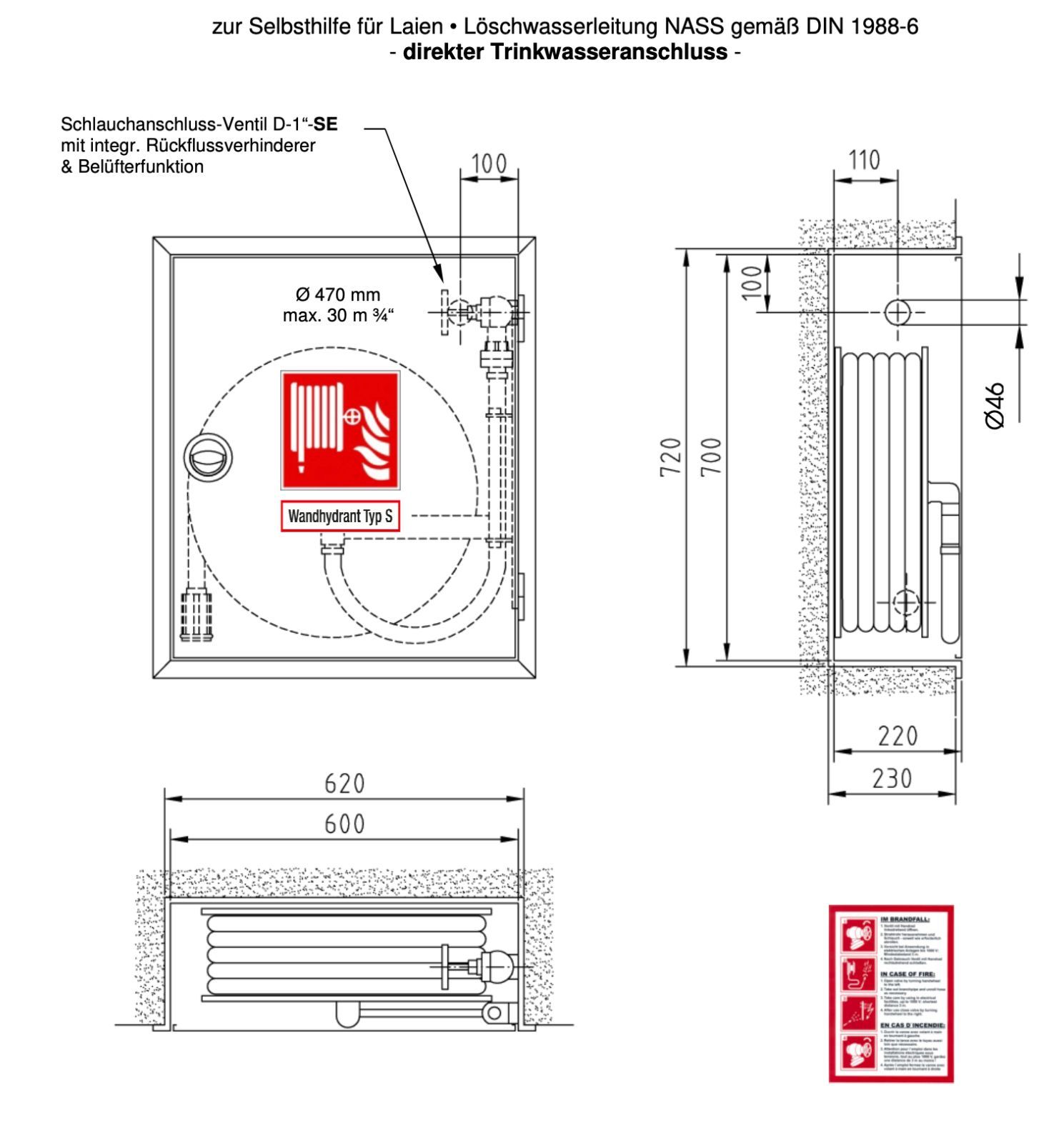 Wandhydranten mit formstabilem Schlauch Typ S nach DIN 14461-1 mit Schlauchhaspel nach DIN EN 671-1 zum Anschluss an die Trinkwasserleitung nach DIN 1988-6 zur Erstbrandbekämpfung durch Laien Unterputzschrank Bauart B 600 x 700 x 220 mm (Breite x Höhe x Tiefe) nach DIN 14461-1. Erforderliches Nische