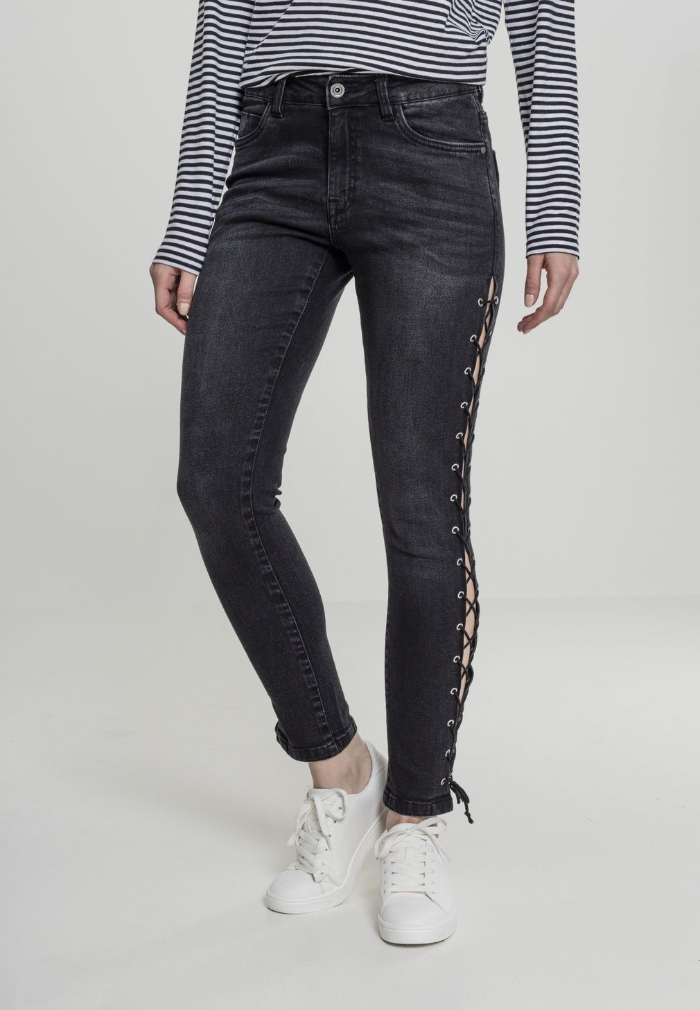 Urban Classics Damen Hose Ladies Denim Lace Up Skinny Pants Black Washed