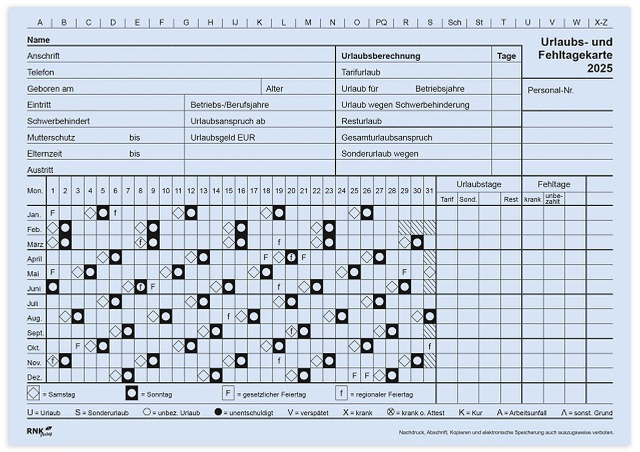 Urlaubs- und Fehltagekarte 2025, grafisch, A5