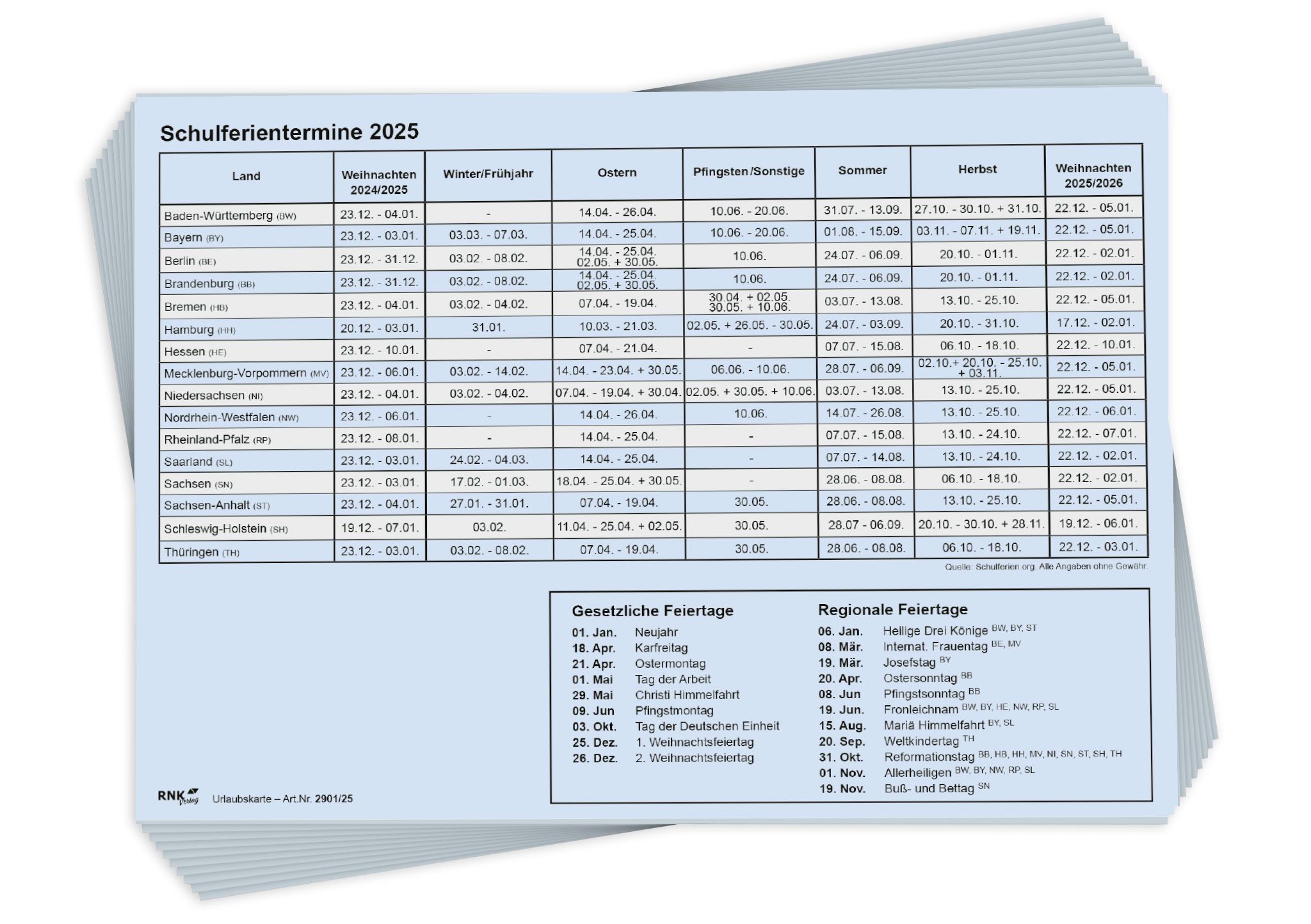 Urlaubs- und Fehltagekarte 2025, tabell., A5, 1 Pkg. à 10 Stk