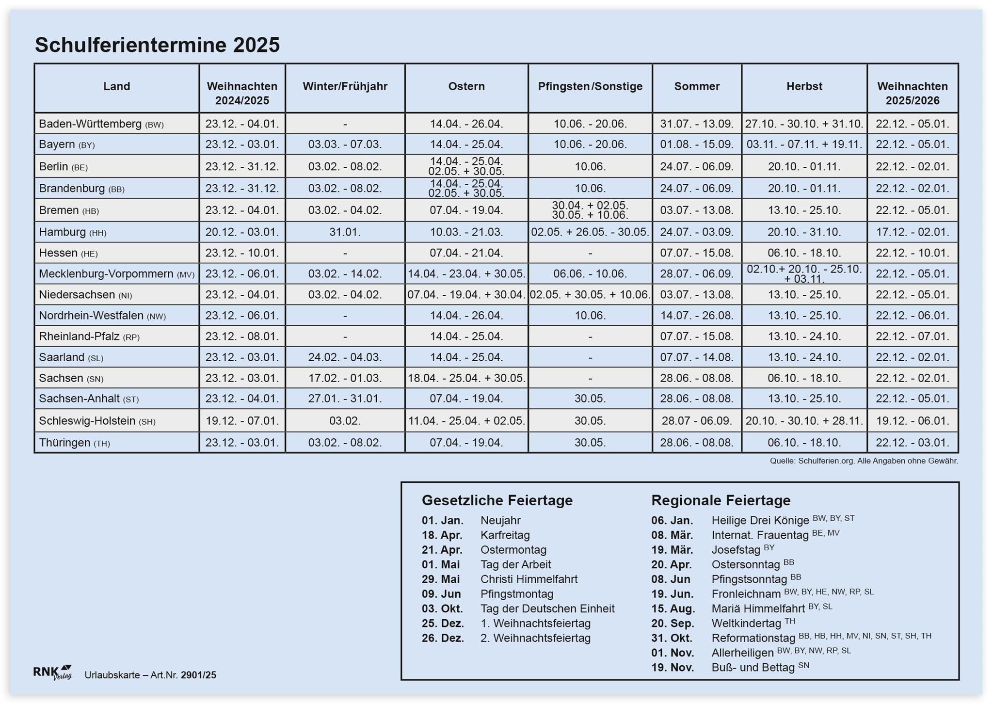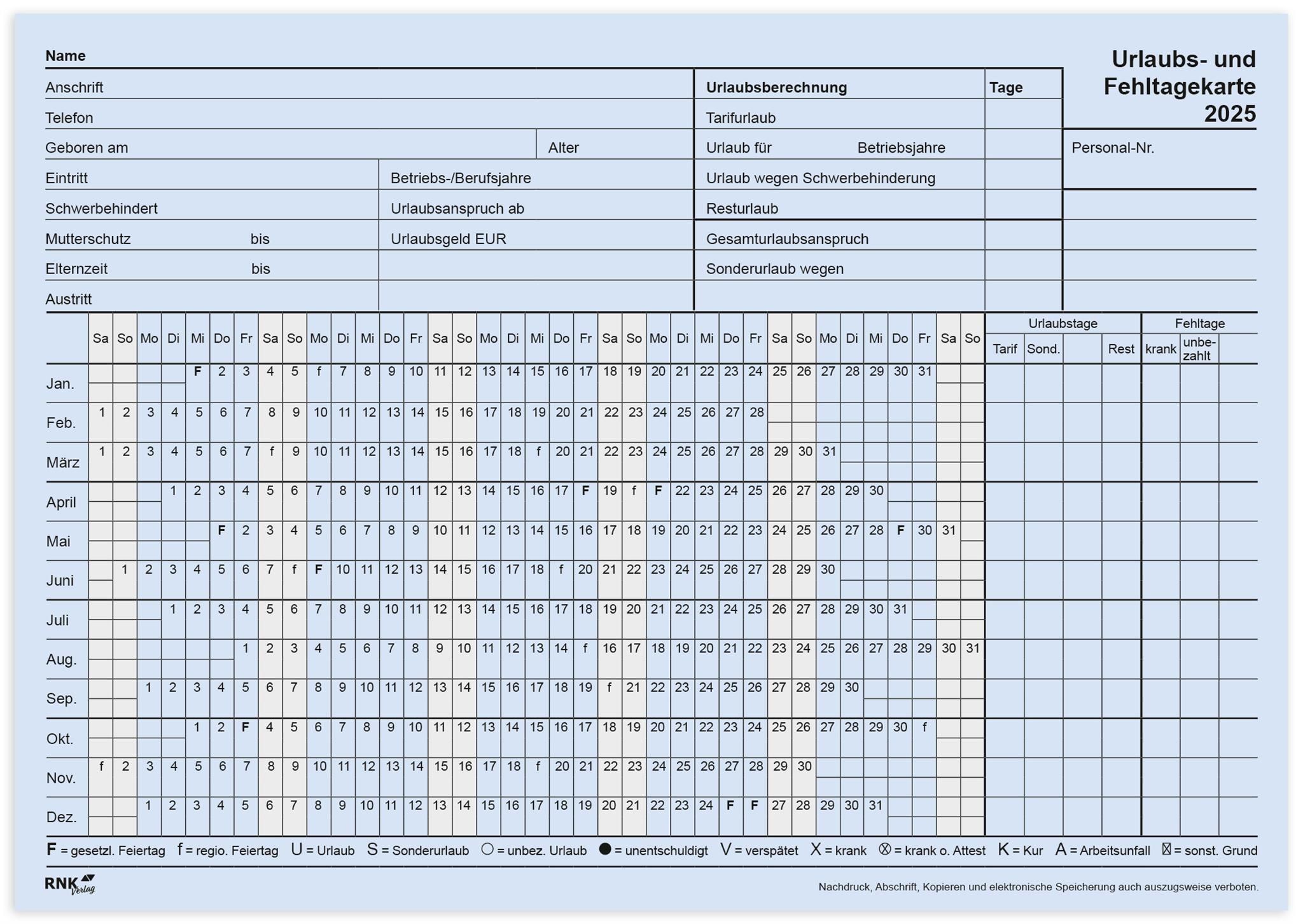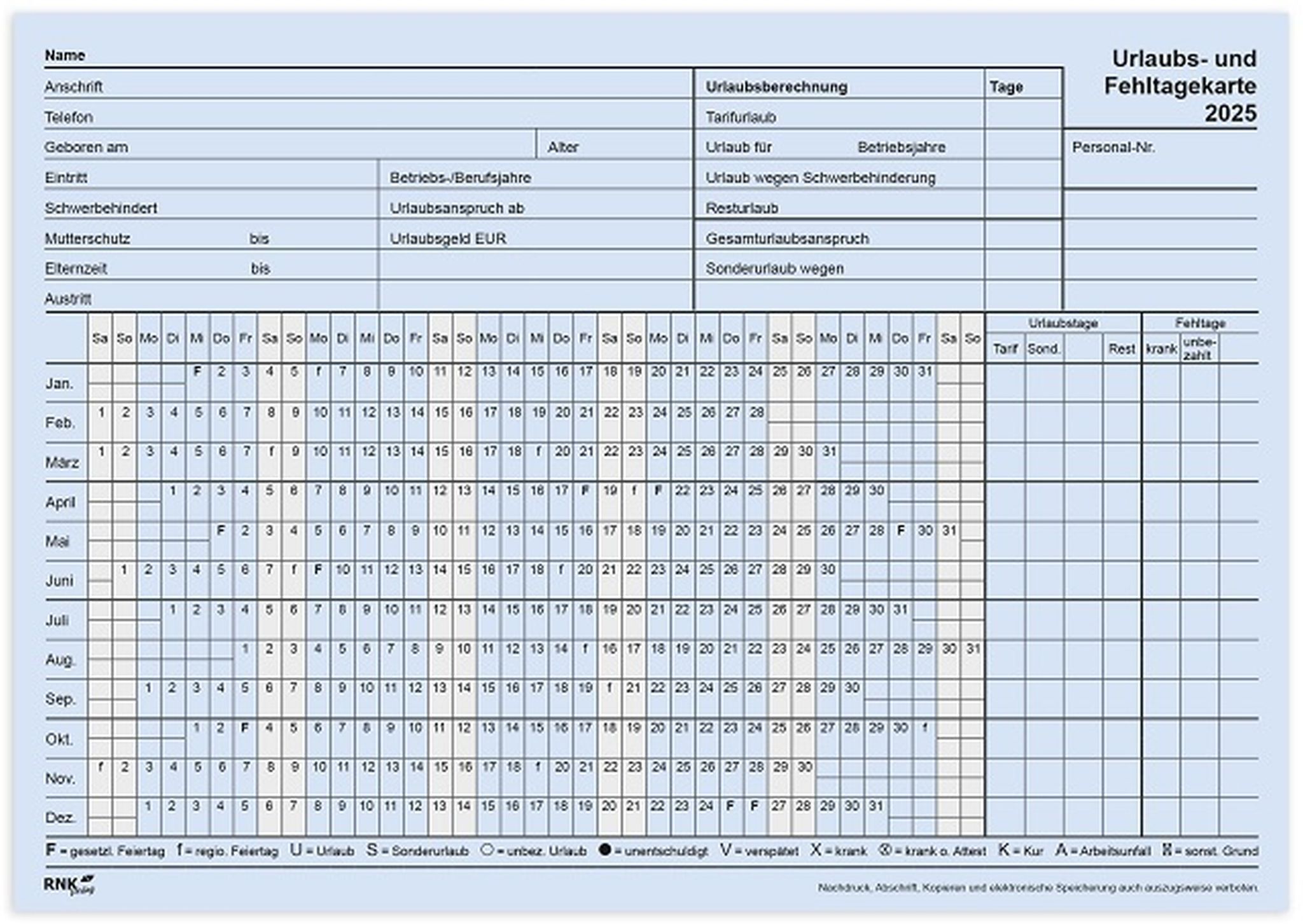 Urlaubs- und Fehltagekarte 2025, tabell., A5