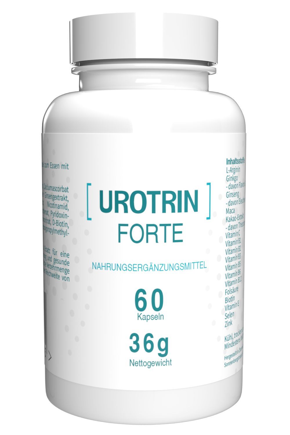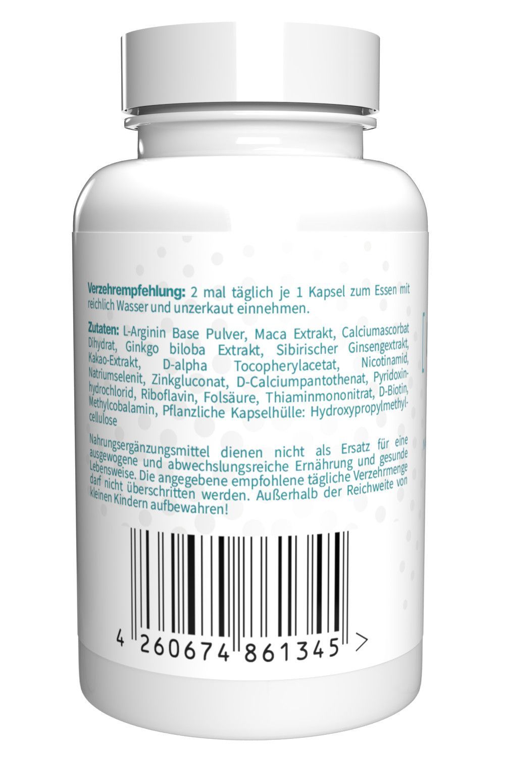 L-Arginin Base Pulver, Maca Ext., Calciumascorbat Dihydrat, Ginkgo biloba Ext., Sib. GinsengExt., Kakao-Ext., D-alpha Tocopherylacetat, Nicotinamid, Natriumselenit, Zinkgluconat, D-Calciumpantothenat, Pyridoxinhydrochlorid, Riboflavin, Folsäure, Thiaminmononitrat, D-Biotin, Methylcobalamin, Pflanzliche Kapselhülle: HPMC