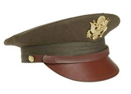 US Offiziers-Schirmmütze Visor Hat der amerikanischen Streitkräfte , wie sie im zweiten Weltkrieg getragen wurde. Reproduktion, Farbe: oliv braun. Obermaterial: Wolle Polyester. Schirm: Kunststoff. Schweissband Kinnriemen: Leder. Abzeichen Knöpfe: Metall. Größe: L (Umfang ca. 60 cm) enthält nicht te