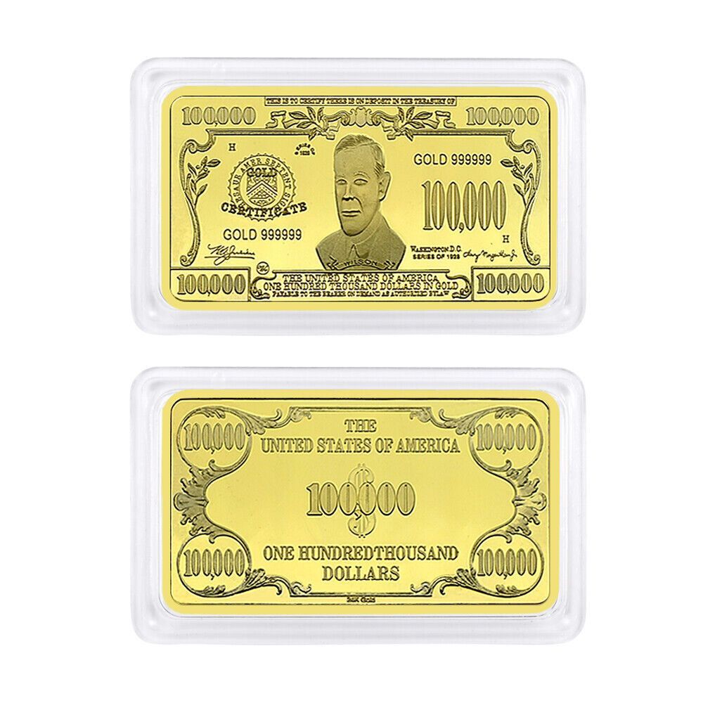 seltener USA Barren Dollar Souvenier Barren wie abgebildet 100000 Dollar Diese Barren sind nur selten zu bekommen und wurden nur in kleiner Menge hergestellt. Nachprägung Ideal für Sammler oder auch einfach nur ein schönes Geschenk. vergoldet Maße ca. 5 x 3 x 2,9 mm Gewicht für 1 Barren ist ca. 32,2