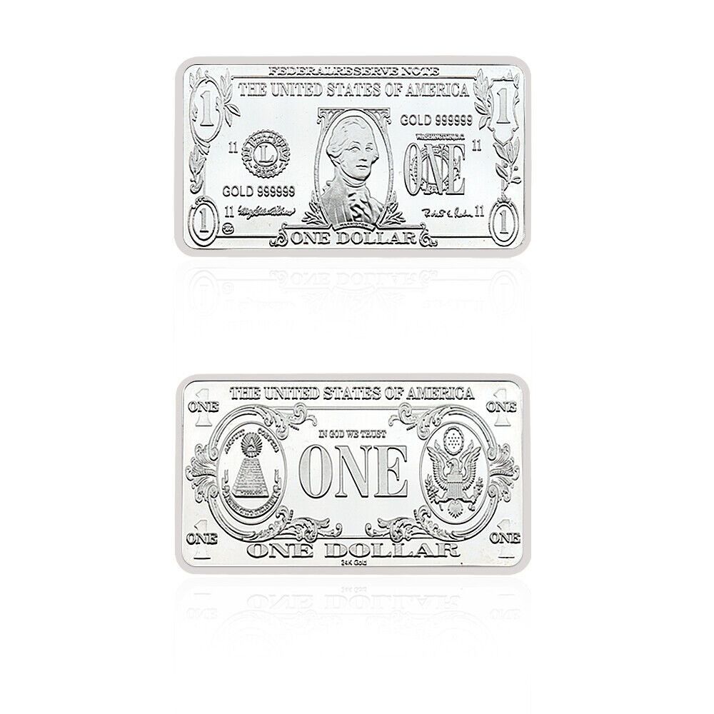 seltener USA Barren Dollar Souvenier Barren wie abgebildet 1 Dollar Diese Barren sind nur selten zu bekommen und wurden nur in kleiner Menge hergestellt. Nachprägung Ideal für Sammler oder auch einfach nur ein schönes Geschenk. Neusilber Maße ca. 5 x 3 x 2,9 mm Gewicht für 1 Barren ist ca. 31,1 Gram