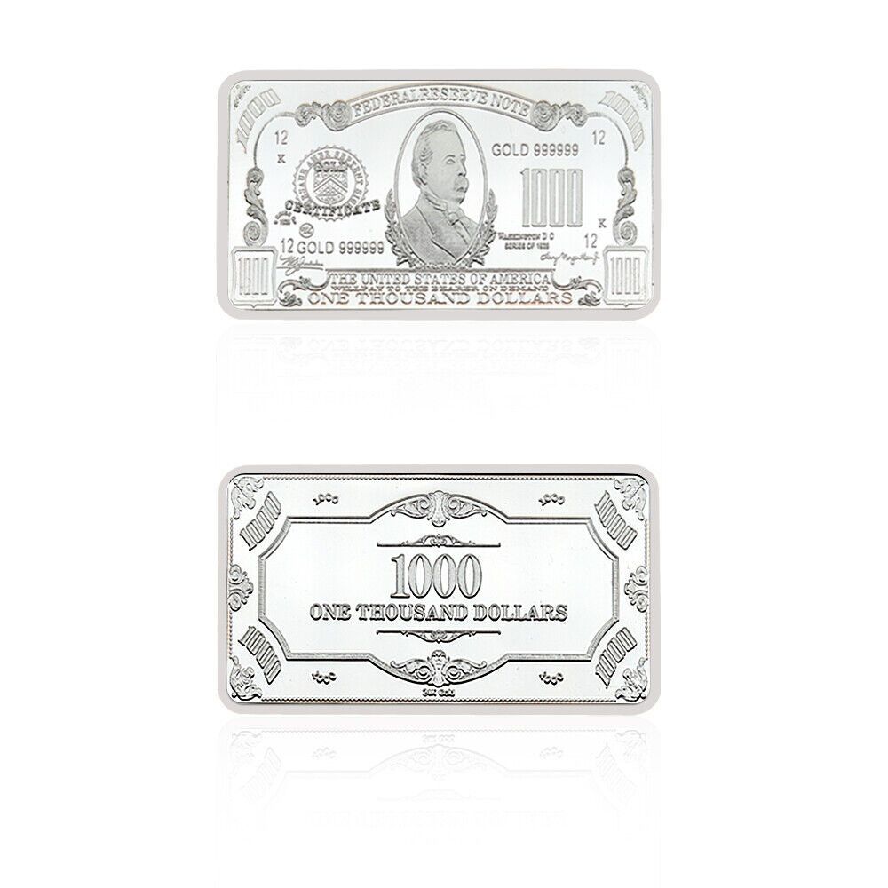 seltener USA Barren Dollar Souvenier Barren wie abgebildet 1000 Dollar Diese Barren sind nur selten zu bekommen und wurden nur in kleiner Menge hergestellt. Nachprägung Ideal für Sammler oder auch einfach nur ein schönes Geschenk. Neusilber Maße ca. 5 x 3 x 2,9 mm Gewicht für 1 Barren ist ca. 31,1 G