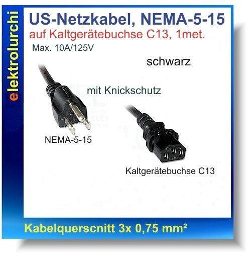 Sie bieten hier auf folgenden Artikel 1 Stück.USA Netzkabel 125V 10A AC, 3x 0,75 mm², 1met. Kaltgerätebuchse C13 auf NEMA-5-15 mit Knickschutz Technische Daten Kabel-Art: USA Netzkabel Spannung: 110V AC, 10Amp. (Wechselstrom) Querschnitt: 3x 0,75 mm² Anschluss A: Kaltgerätebuchsenstecker C13 Anschlu