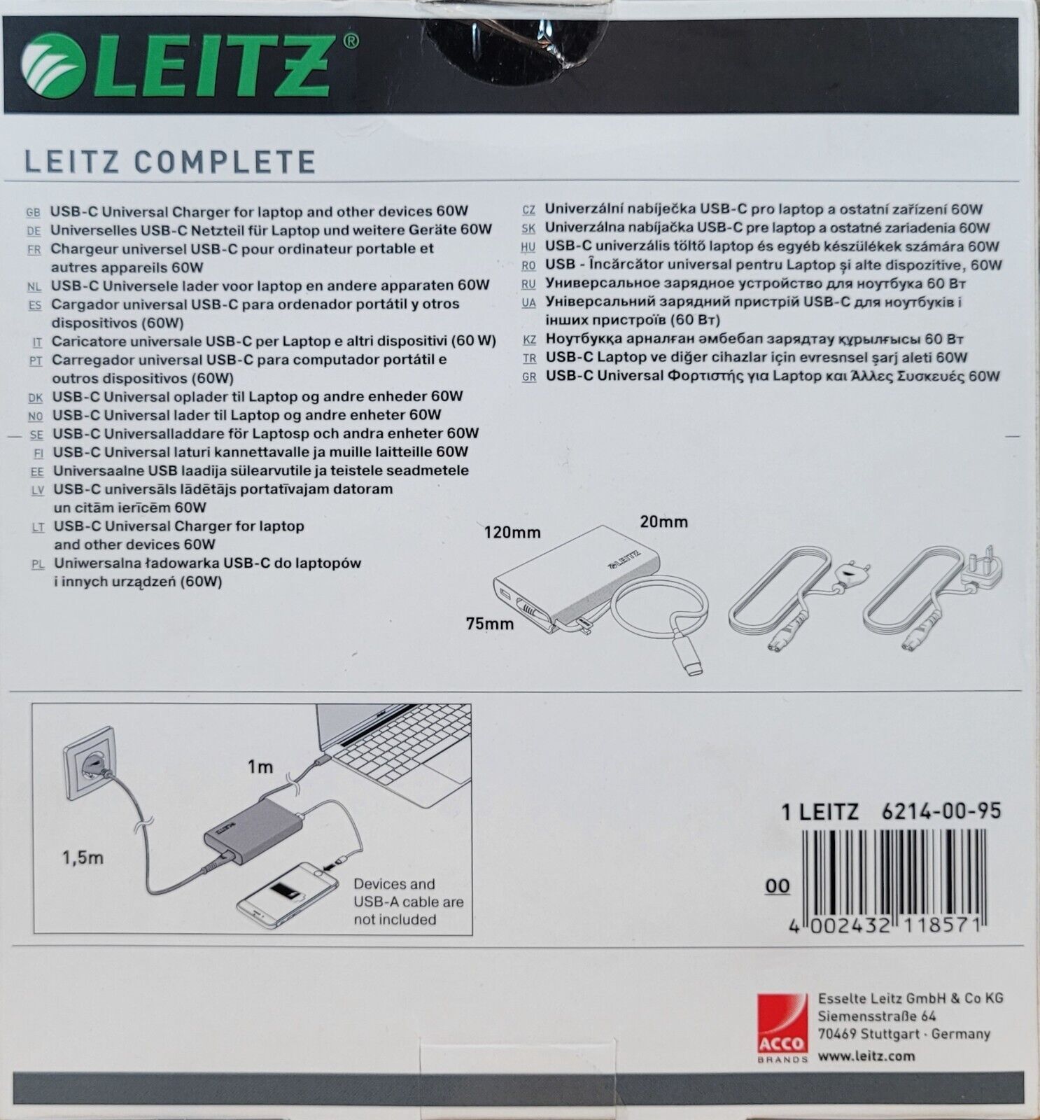 leitz USB-C Notebook Netzteil / USB-A Netzteil Ladegerät 60 W für Smartphone Tablet