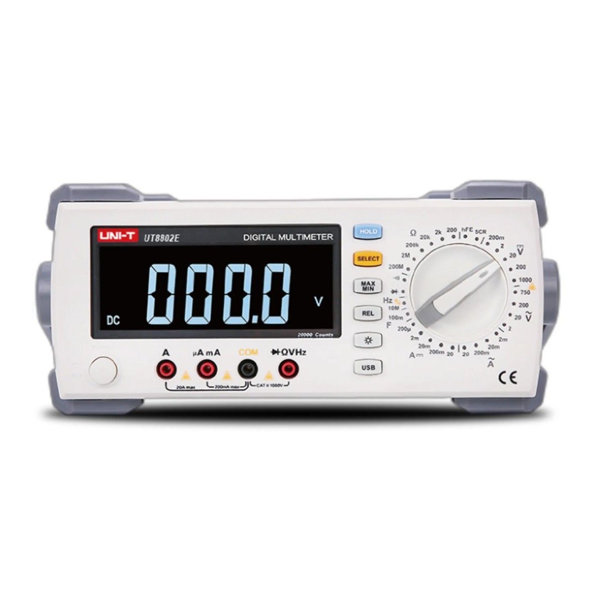 Das UT8802E ist ein digitales Tischmultimeter mit manuellem Bereich, das über 19999 Anzeigezählungen, einen großen Bildschirm mit Hintergrundbeleuchtung, Volllastschutz und ein einzigartiges Design verfügt. Dieses Instrument kann verwendet werden, um AC- und DC-Spannung, AC- und DC-Strom, Widerstand, Frequenz, Kapazität, Transistor, hFE, Diode (LED), SCR, Kontinuität usw. zu messen.