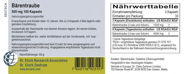 Uva Ursi (Bärentraube), Dr. Clark, 500 mg 100 Kaps.