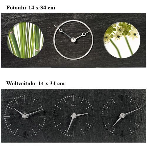 Vaerst Weltzeituhr oder Fotouhr aus Naturschiefer Benötigt wird 1 Batterie des Typs AA. Maße der Uhren: 14 cm x 37 cm Material: Naturschiefer Batterien sind jeweils nicht im Lieferumfang enthalten.