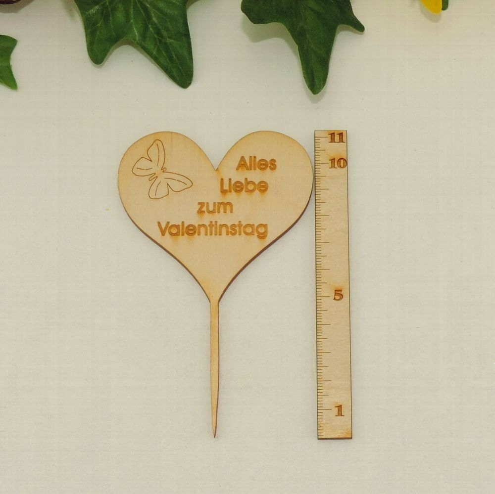 1 Stecker "Alles Liebe zum Valentinstag" graviert mit Schmetterling Das Herz ist genau das Richtige als Stecker für Torten, Kuchen oder Cupkake. Aber auch als Blumenstecker peppt unser Herz den Blumentopf elegant auf! Mit diesem Herz übermitteln Sie einen ganz lieben Valentinstagsgruß. Herz: ca. 11 x 7 cm Stärke: 3 mm Wir sind deutscher Hersteller mit Sitz in Mecklenburg Vorpommern.