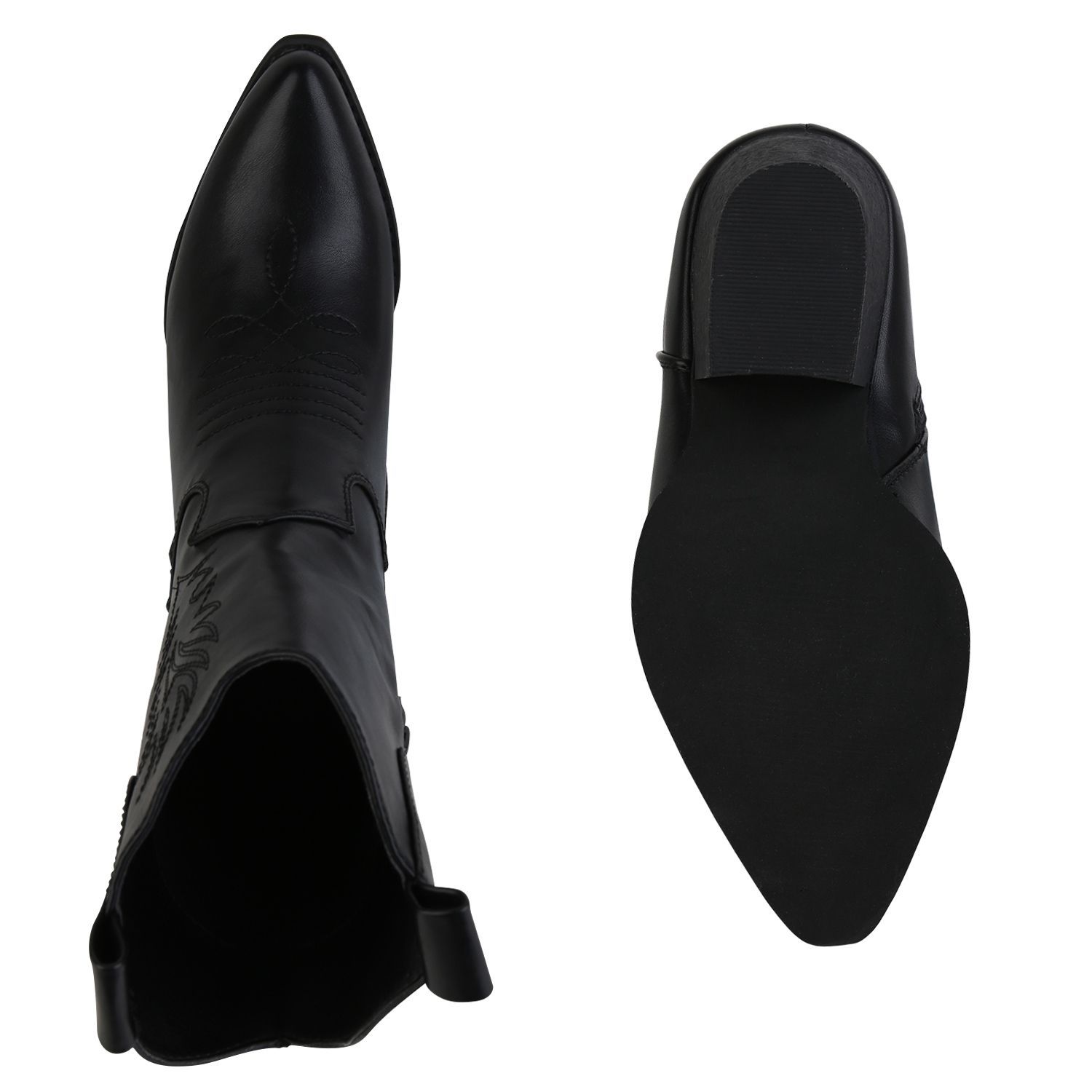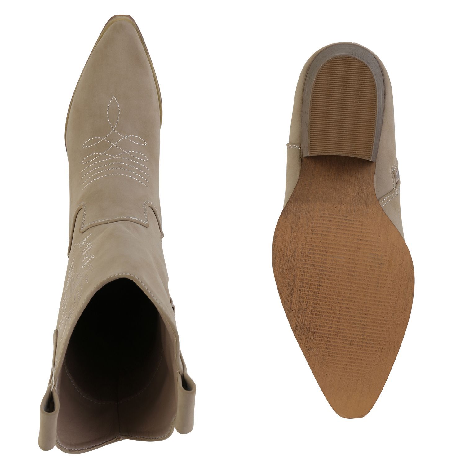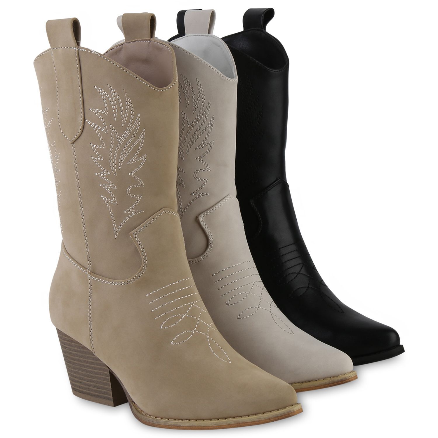 VAN HILL Damen Cowboy Boots Stiefeletten Stickereien Holzoptikabsatz Schuhe 839873