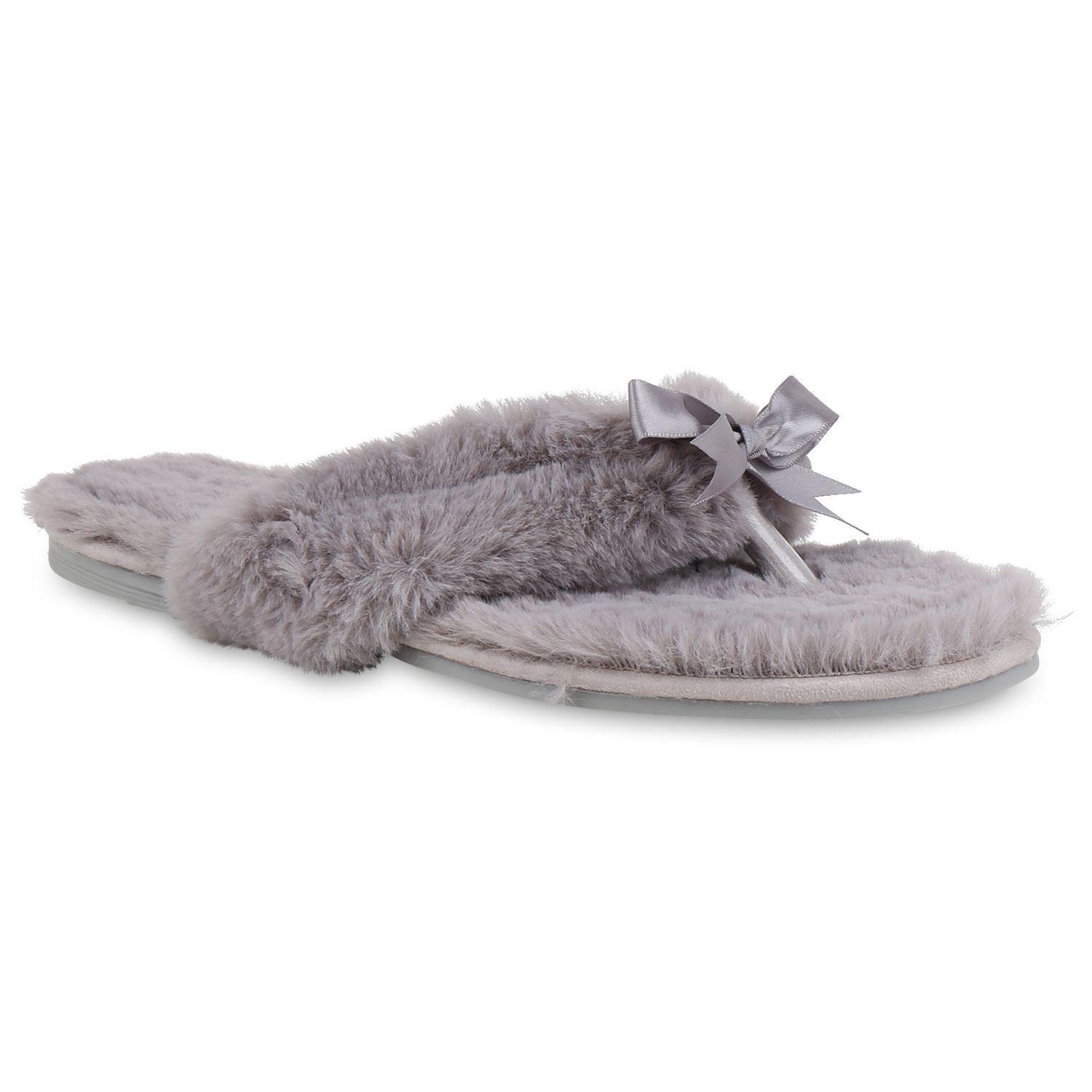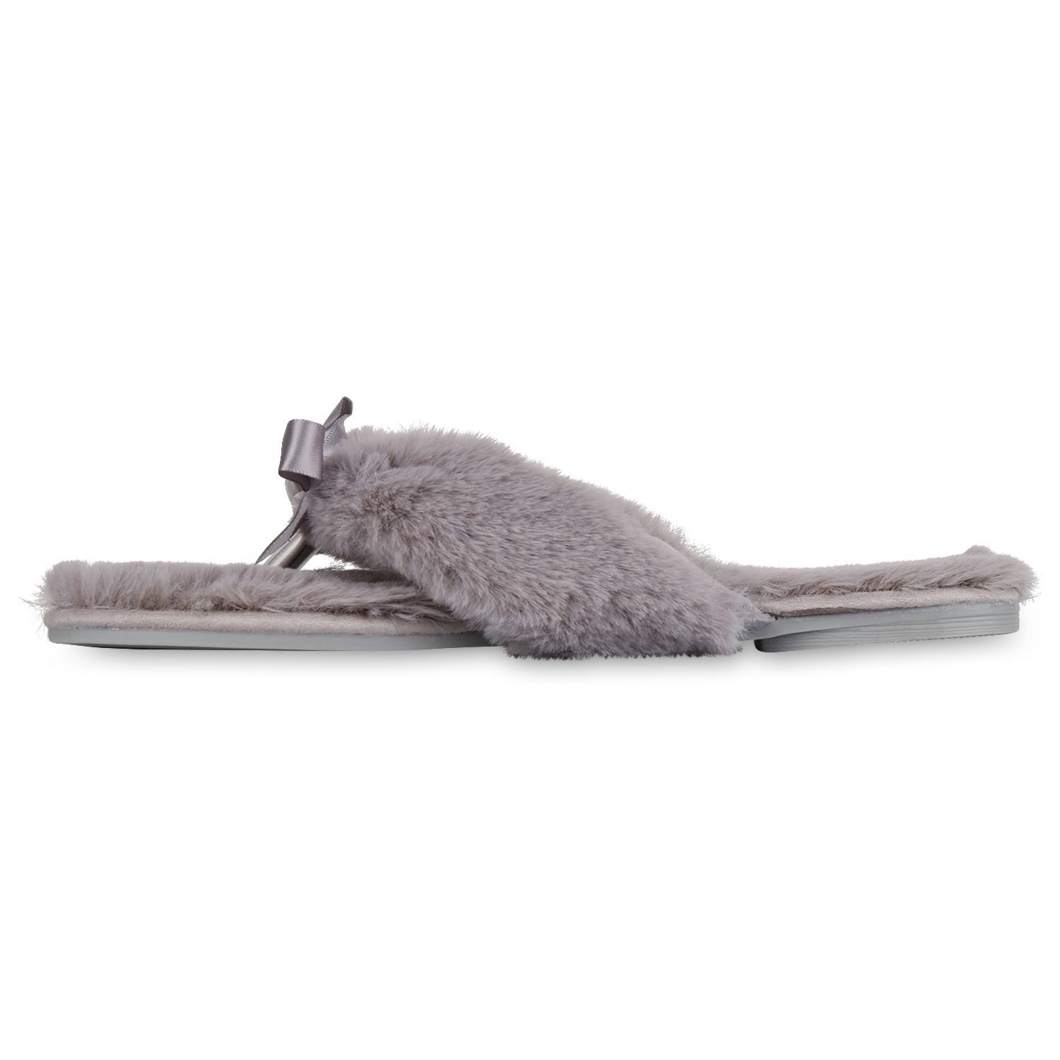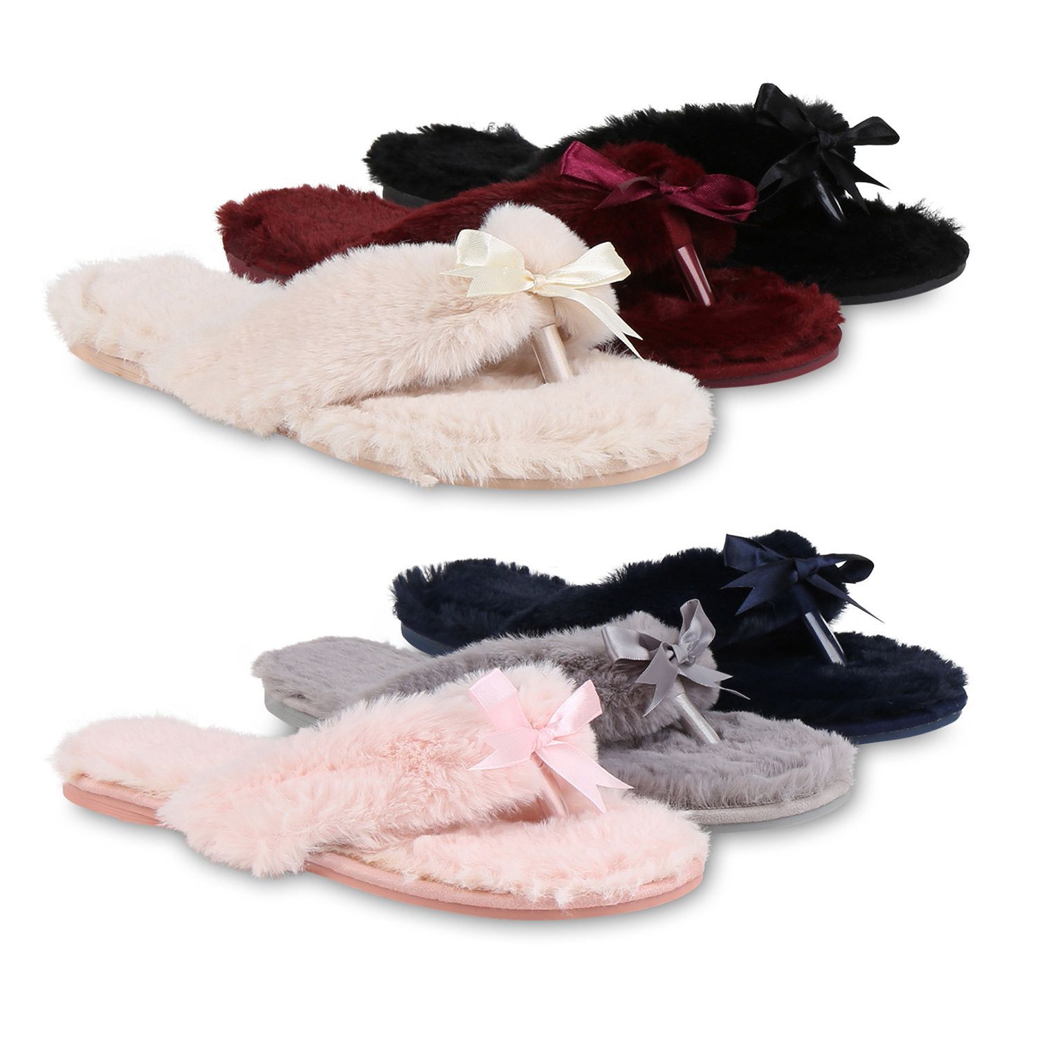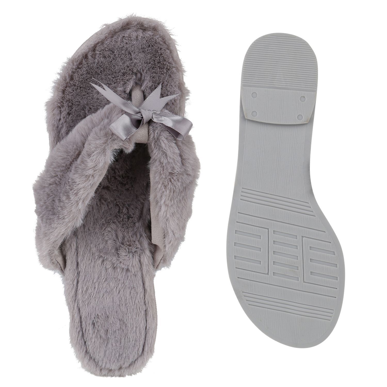 VAN HILL Damen Hausschuhe Warm Gefütterte Sandalen Zehentrenner Schleifen 818526