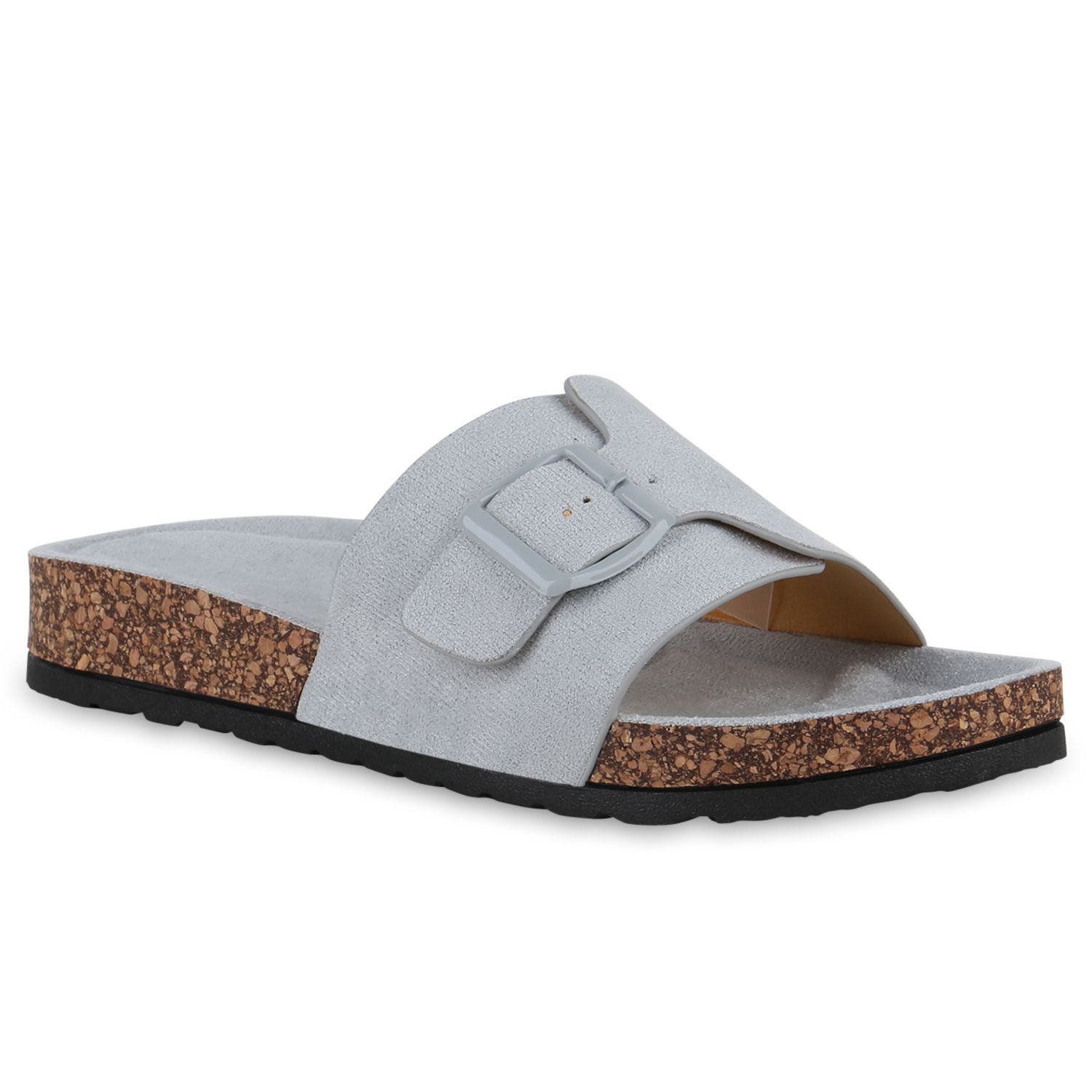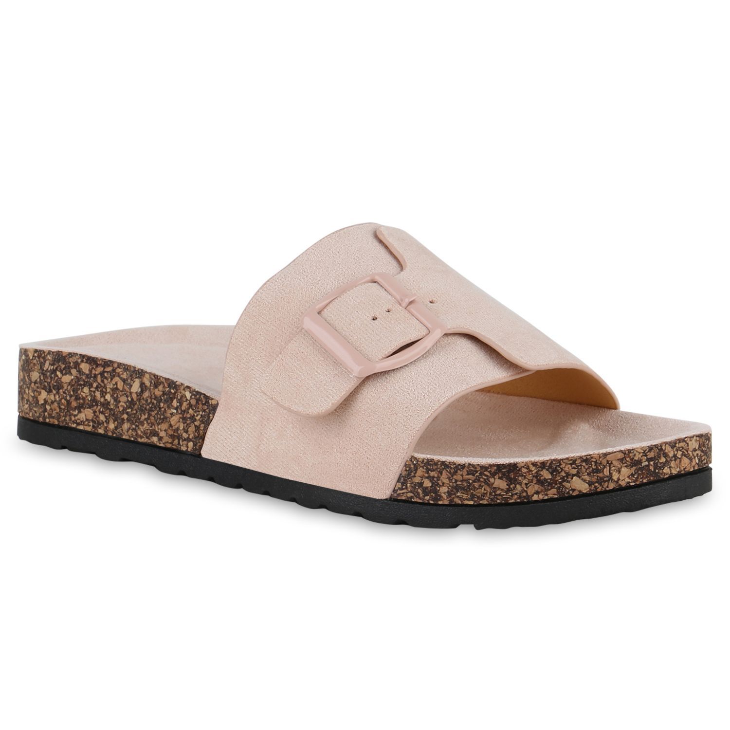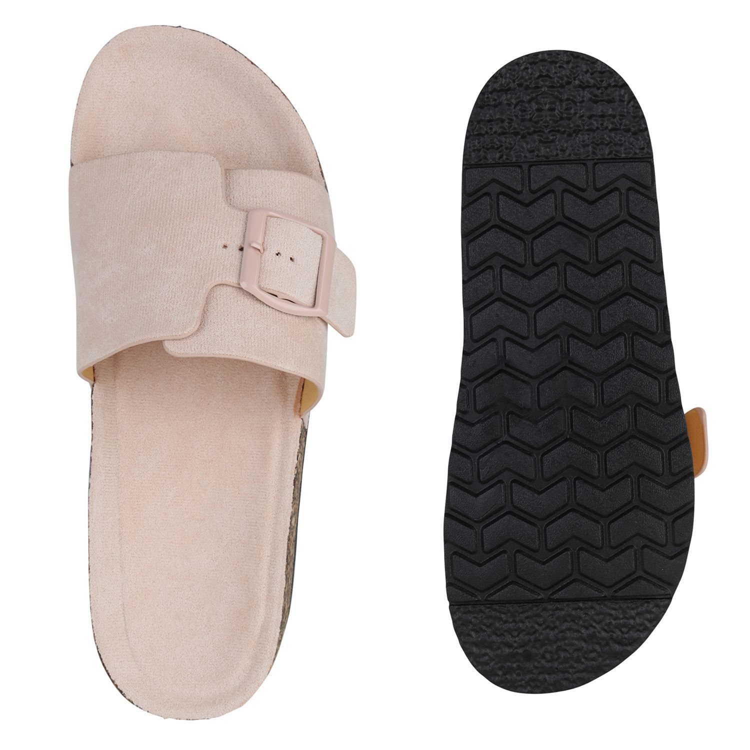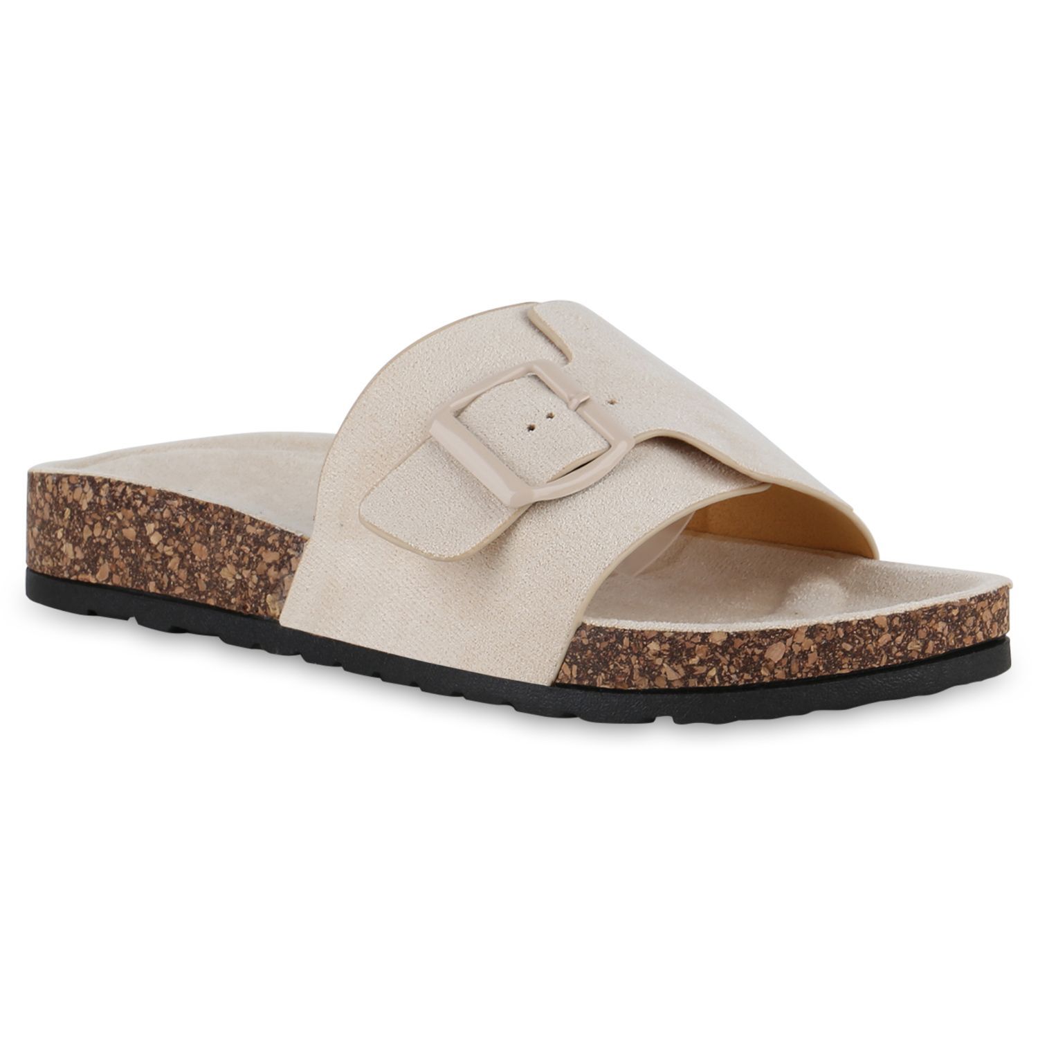 VAN HILL Damen Pantoletten Sandalen Schnallen Korkoptik Profil-Sohle Schuhe 841089
