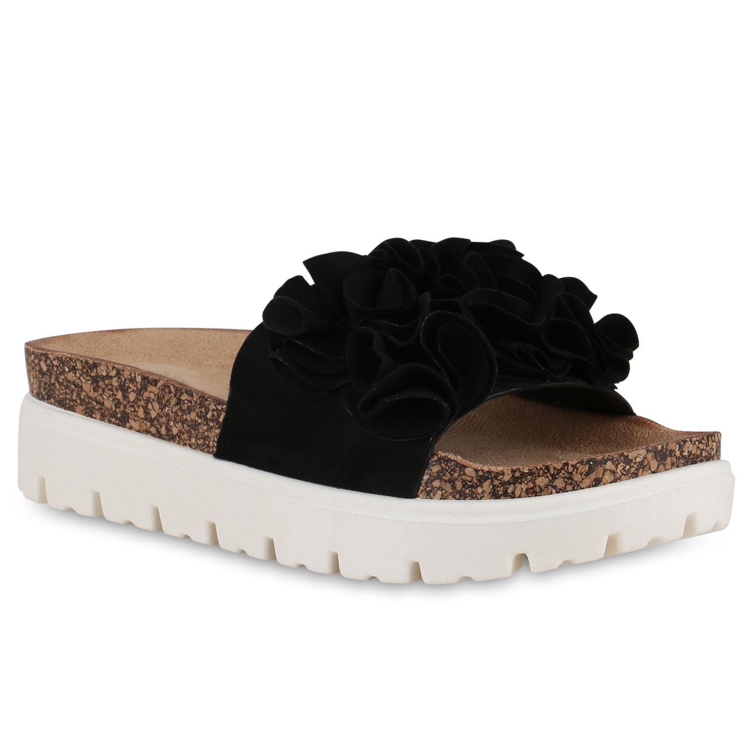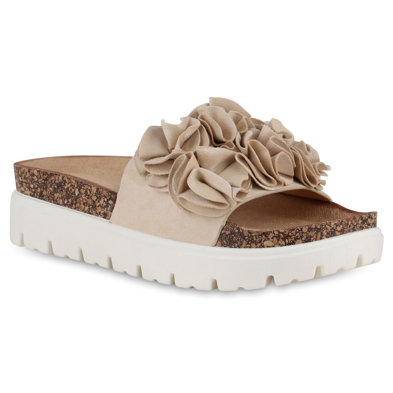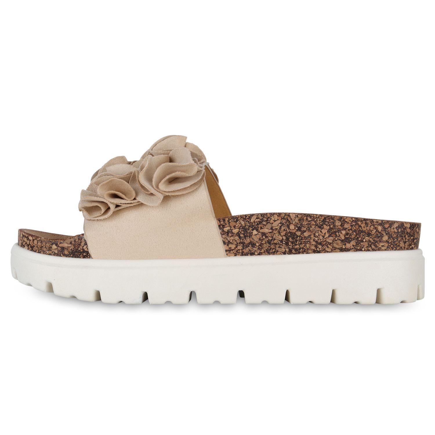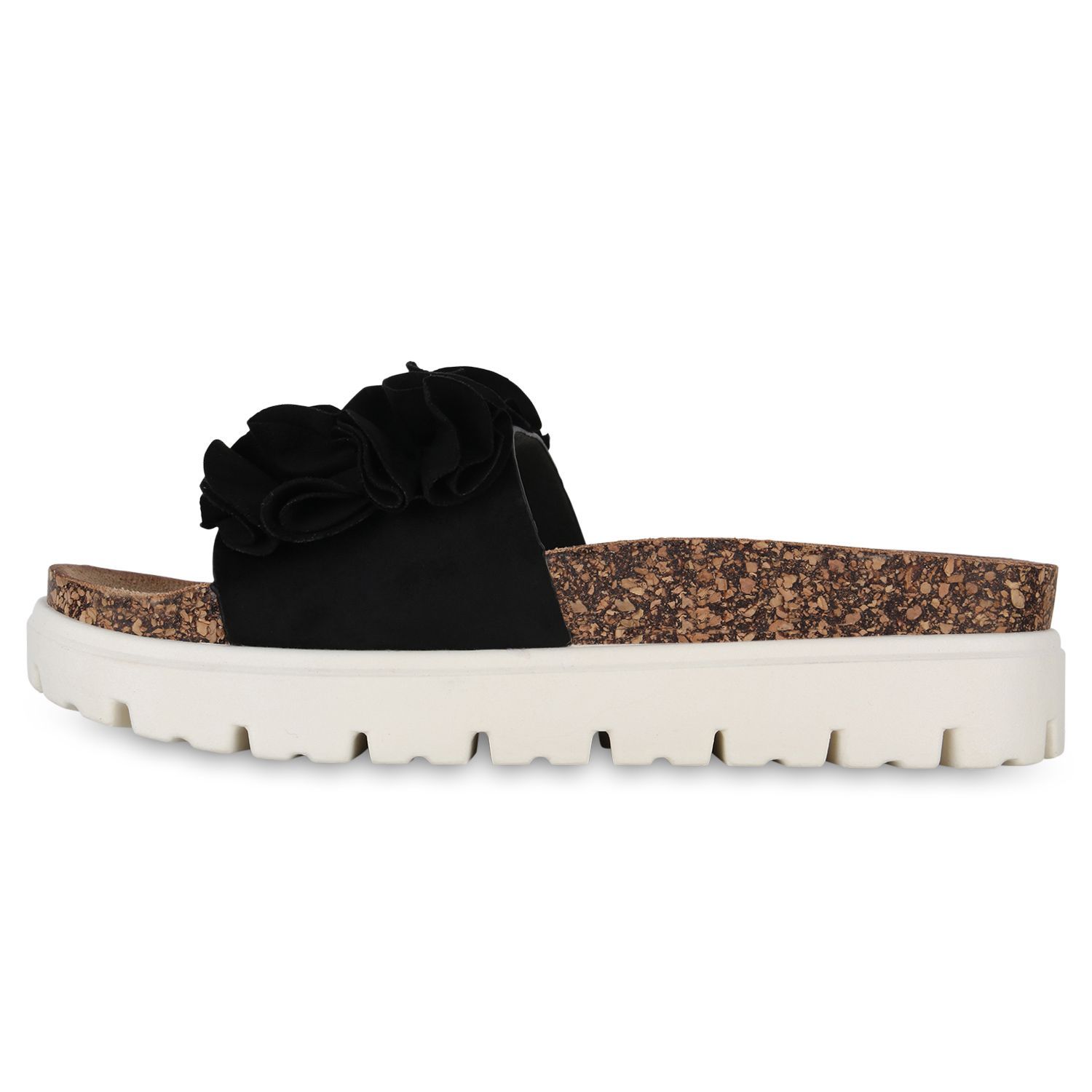 VAN HILL Damen Pantoletten Sandaletten Korkoptik Volant Profil-Sohle Schuhe 841092