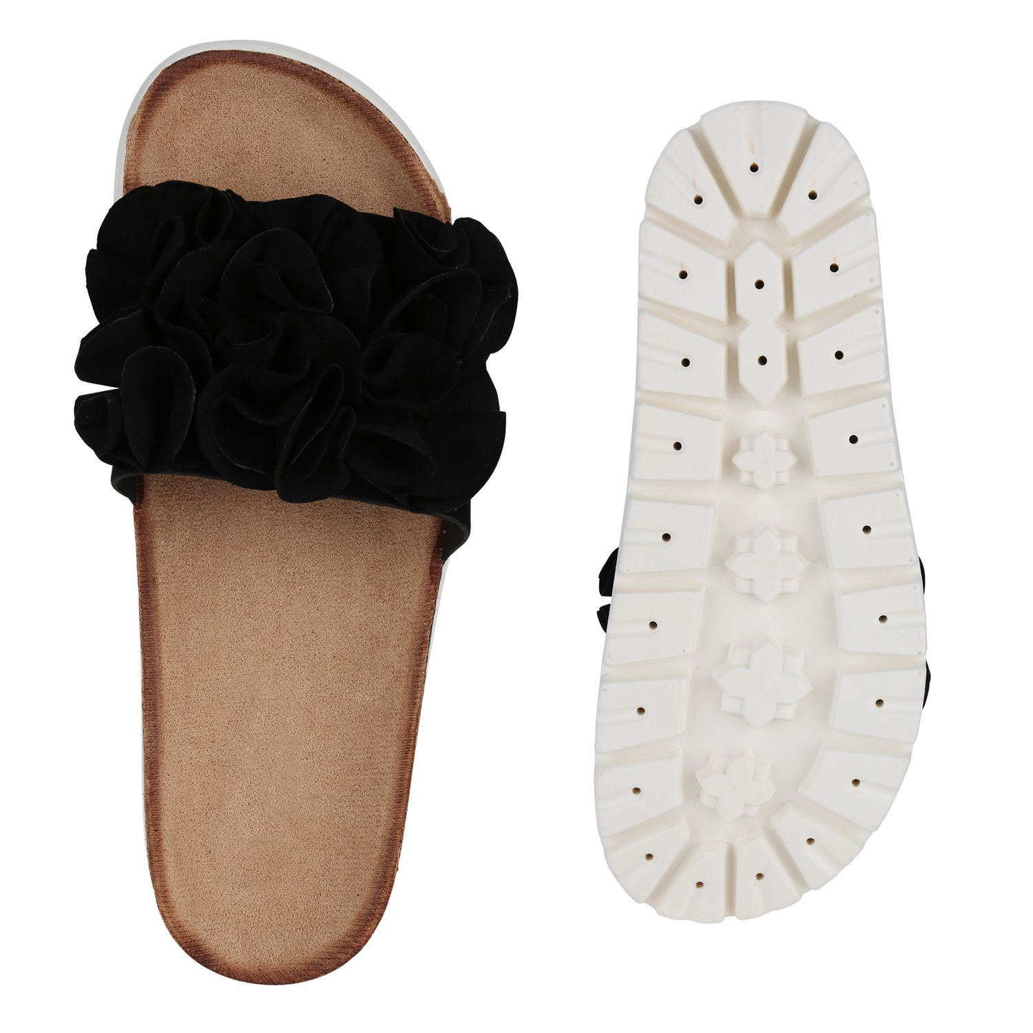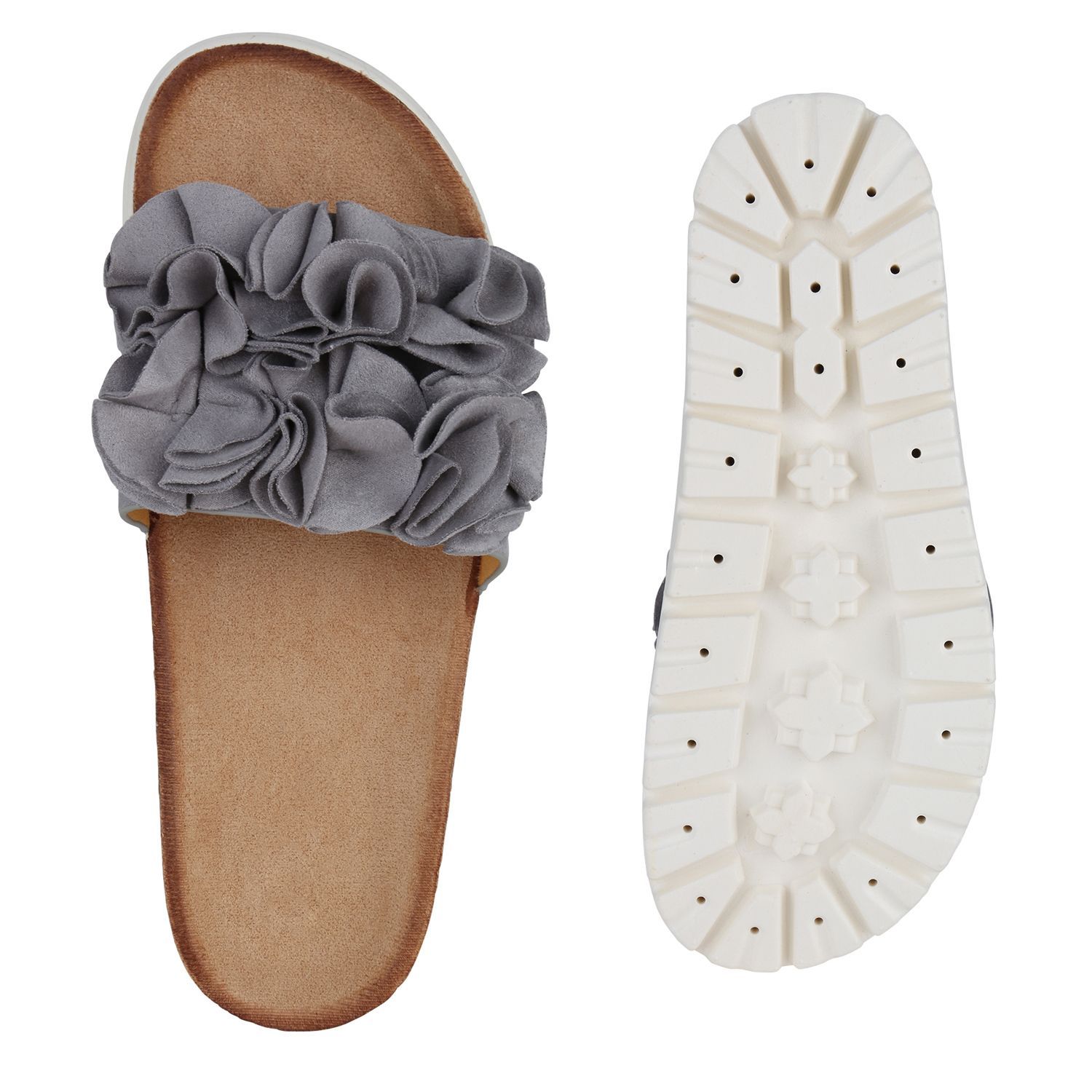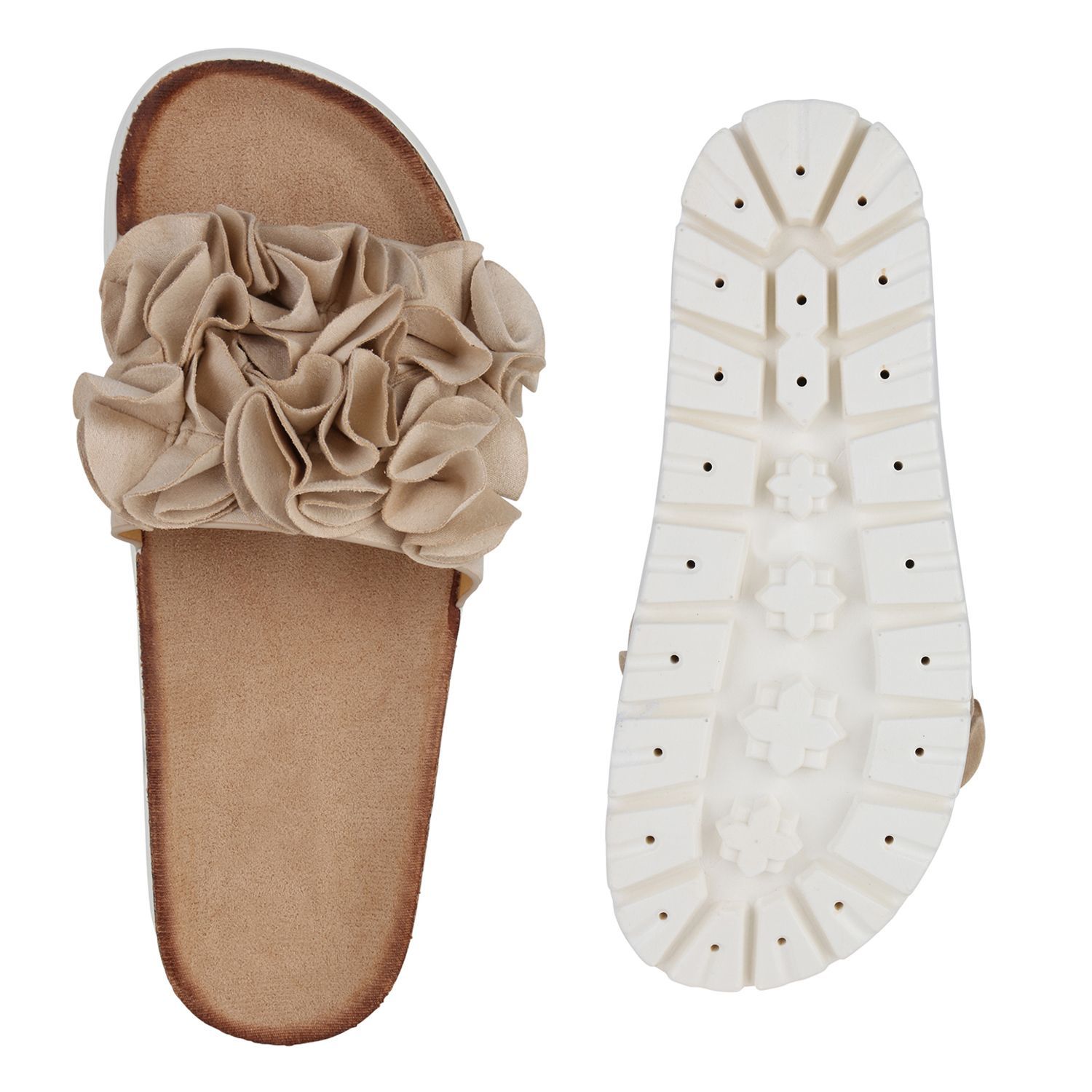 VAN HILL Damen Pantoletten Sandaletten Korkoptik Volant Profil-Sohle Schuhe 841092