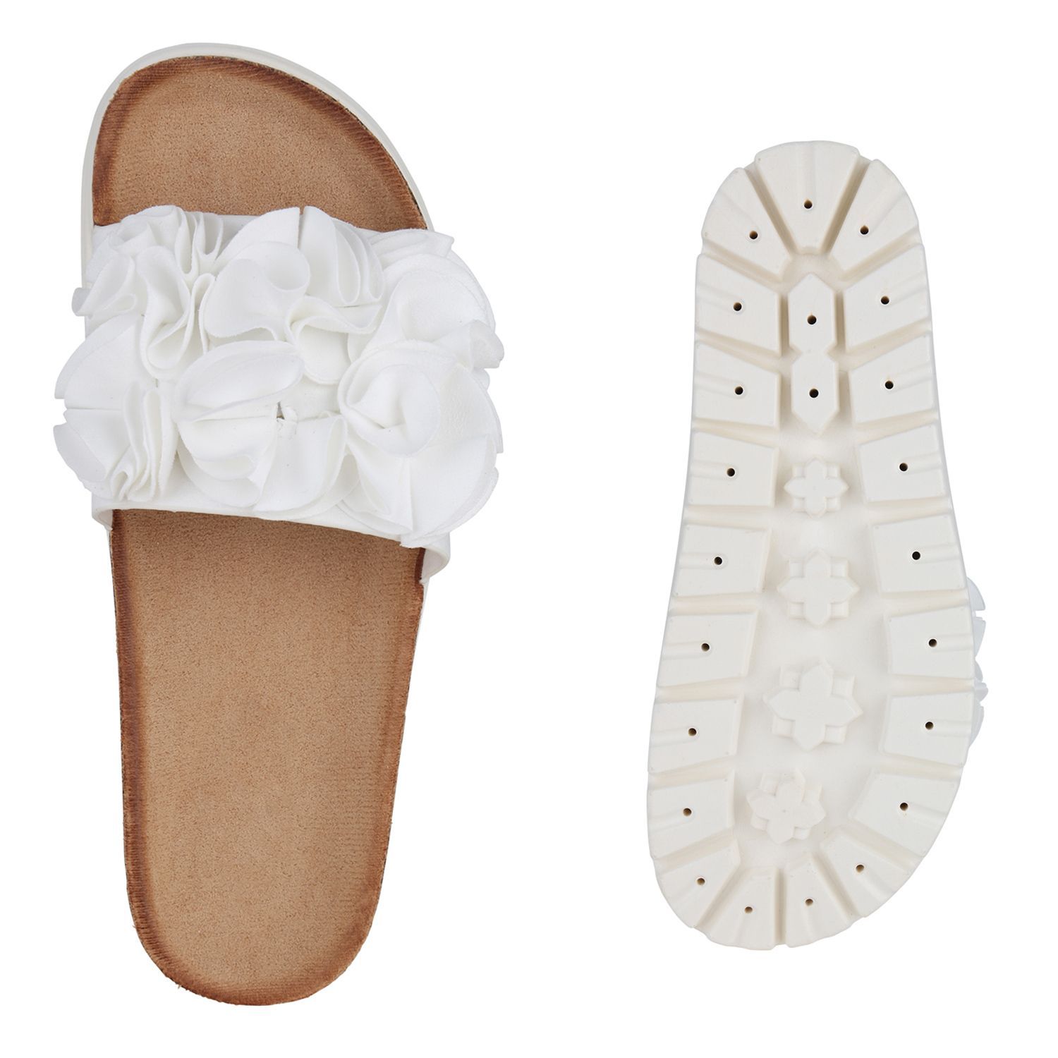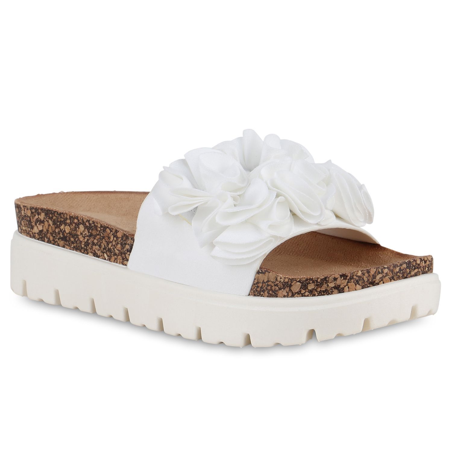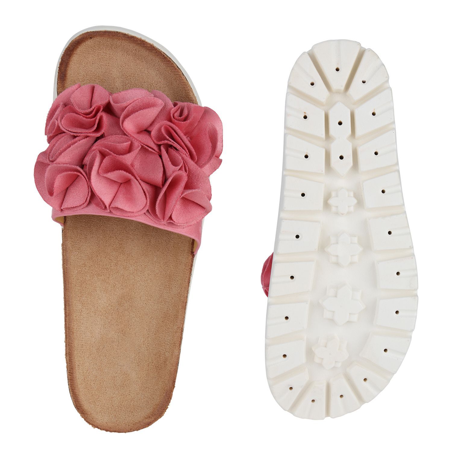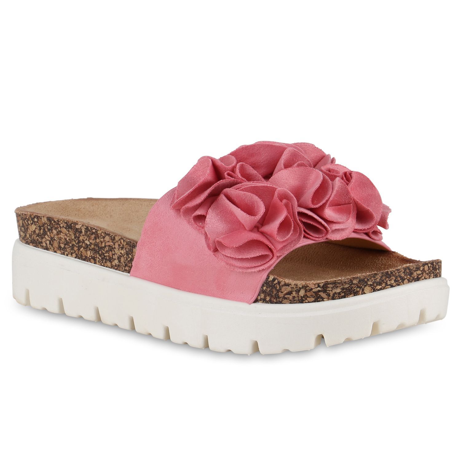 VAN HILL Damen Pantoletten Sandaletten Korkoptik Volant Profil-Sohle Schuhe 841092